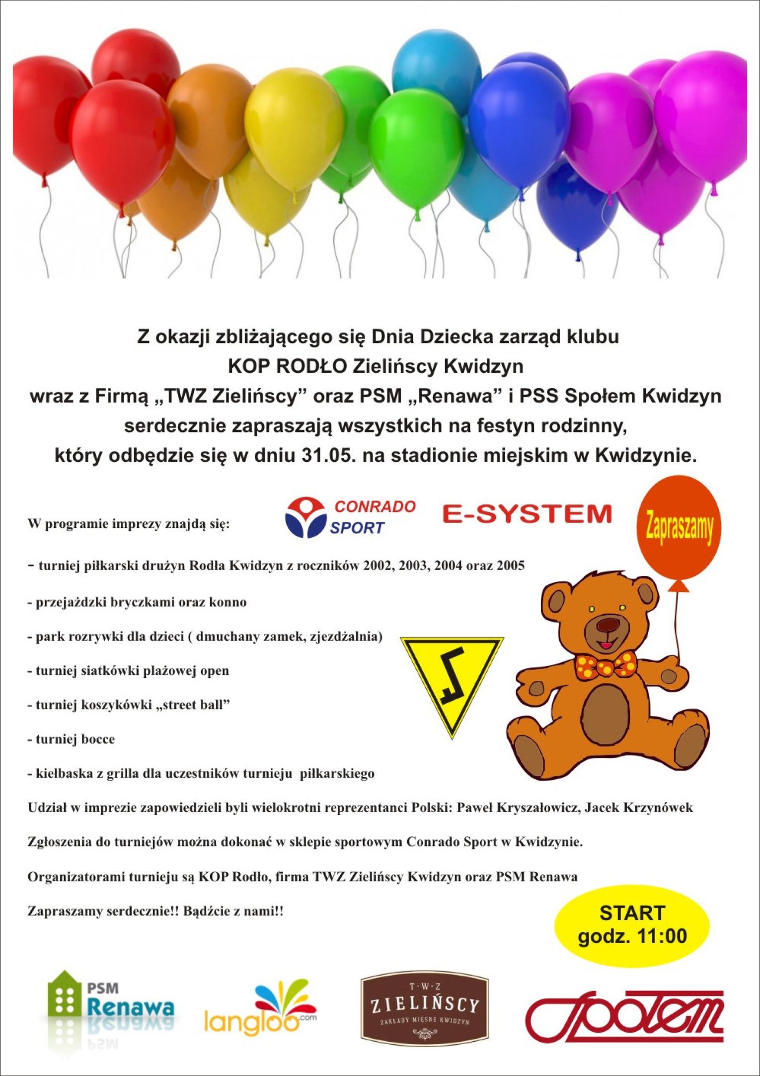 Z okazji zbliżającego się Dnia Dziecka zarząd kwidzyńskiego Rodła wraz z Firmą „TWZ Zielińscy” oraz PSM „Renawa” zapraszają na festyn rodzinny. Odbędzie się on w najbliższą niedzielę – 31 maja na stadionie przy ul. Sportowej. Wstęp wolny.
