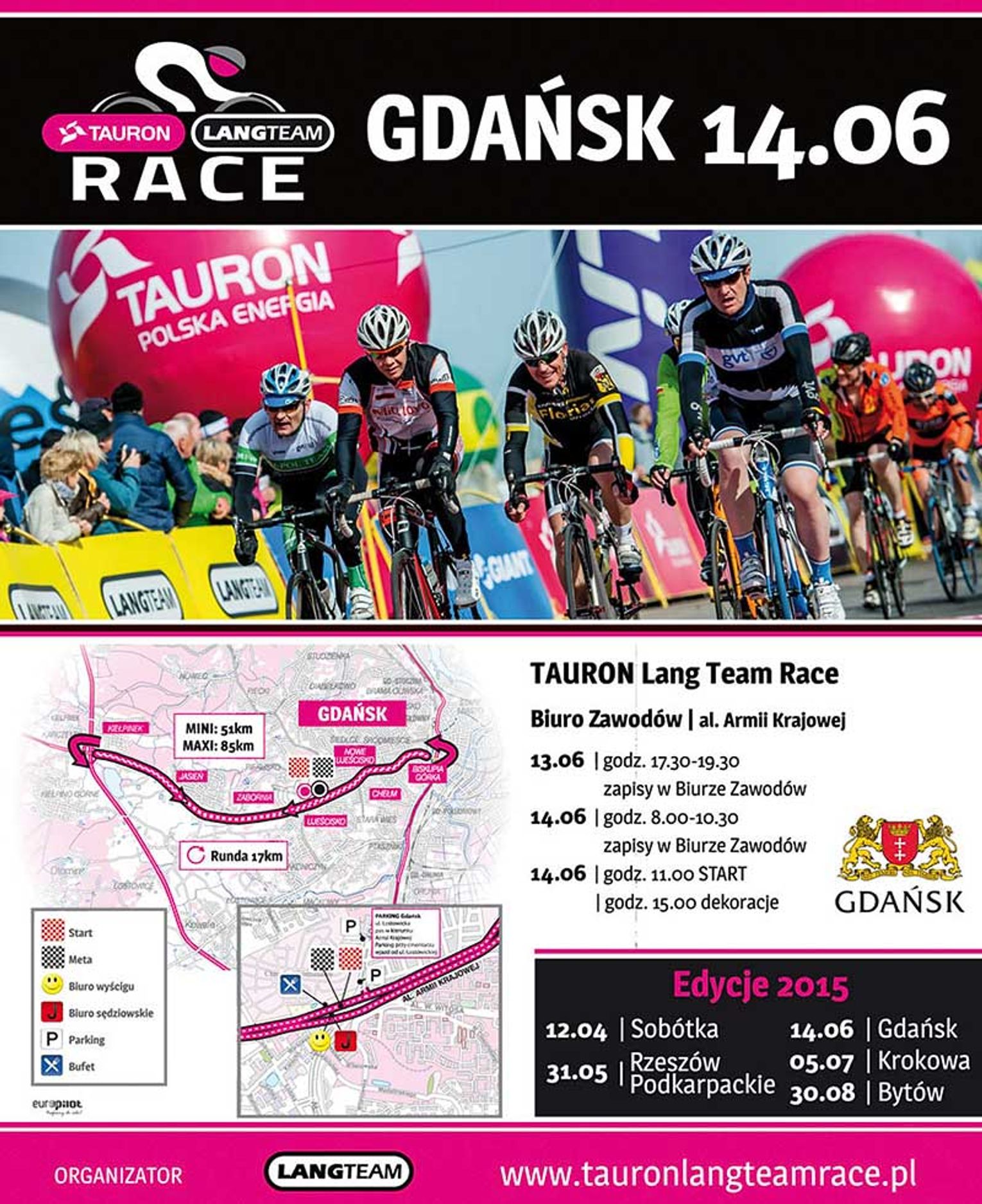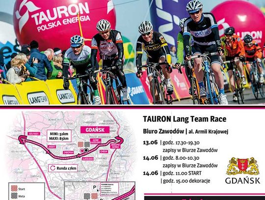 Druga część weekendu będzie należała do kolarzy szosowych. Tauron Lang Team Race to nowy cykl dla amatorów, który jest odpowiedzią na coraz większe zainteresowanie właśnie szosową odmianą kolarstwa. Coraz więcej osób zapatrzonych w sukcesy Michała Kwiatkowskiego i Rafała Majki wskakuje na rower i przemierza drogi w całej Polsce. Szosowe zmagania w Gdańsku zapowiadają się bardzo ciekawie. Trasa dystansu MINI liczy 51 km, a dystansu MAXI 85 kilometrów. Miasteczko wyścigu powstanie przy skrzyżowaniu alei Armii Krajowej z ul. Łostowicką. W przypadku obu dystansów kolarze będą walczyć na 17-kilometrowej rundzie, której trasa w całości prowadzi po drodze dwupasmowej. Jest o co walczyć, bo w Tauron Lang Team Race oprócz atrakcyjnych nagród rzeczowych dla najlepszych trojga zawodników w każdej kategorii wiekowej przewidziane są nagrody finansowe. Zwycięzcy na dystansie MINI otrzymują 350 złotych, a na dystansie MAXI 500 złotych. Gdańska edycja Tauron Lang Team Race jest zaliczana do klasyfikacji Pucharu Polski amatorów w kolarstwie szosowym.