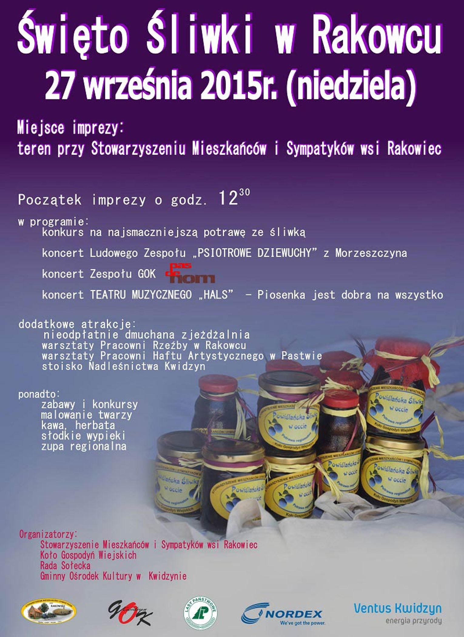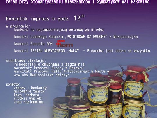 Stowarzyszenie Mieszkańców i Sympatyków Wsi Rakowiec, Koło Gospodyń Wiejskich, Rada Sołecka oraz Gminny Ośrodek Kultury w Kwidzynie zapraszają na Święto Śliwki. Impreza odbędzie się w niedzielę – 27 września na terenie przy świetlicy stowarzyszenia. Wstęp wolny