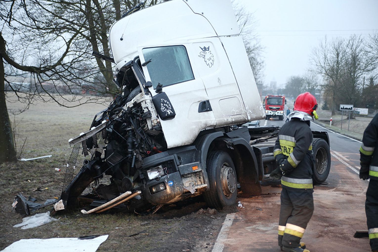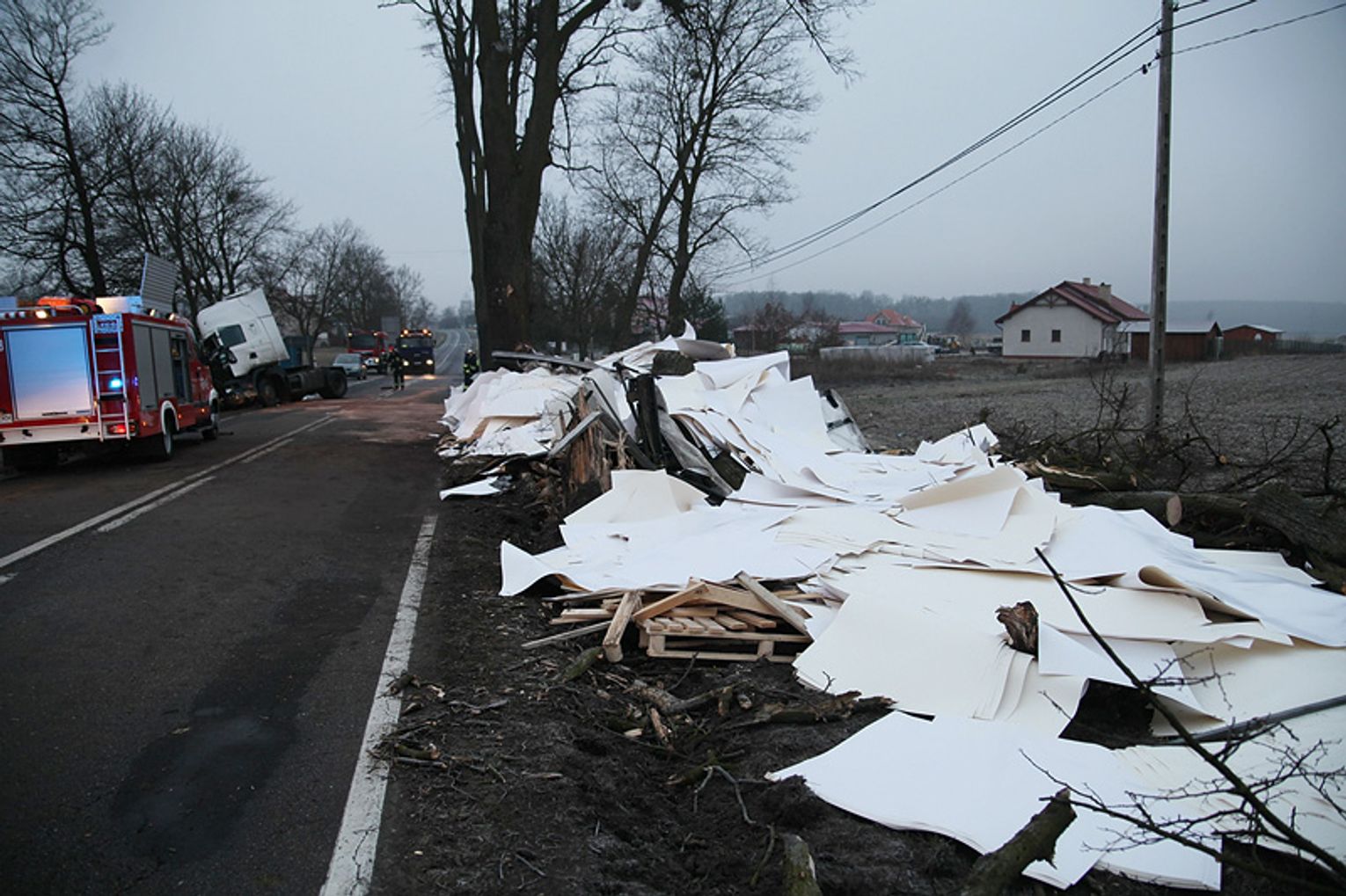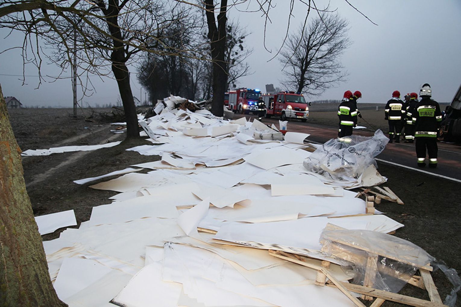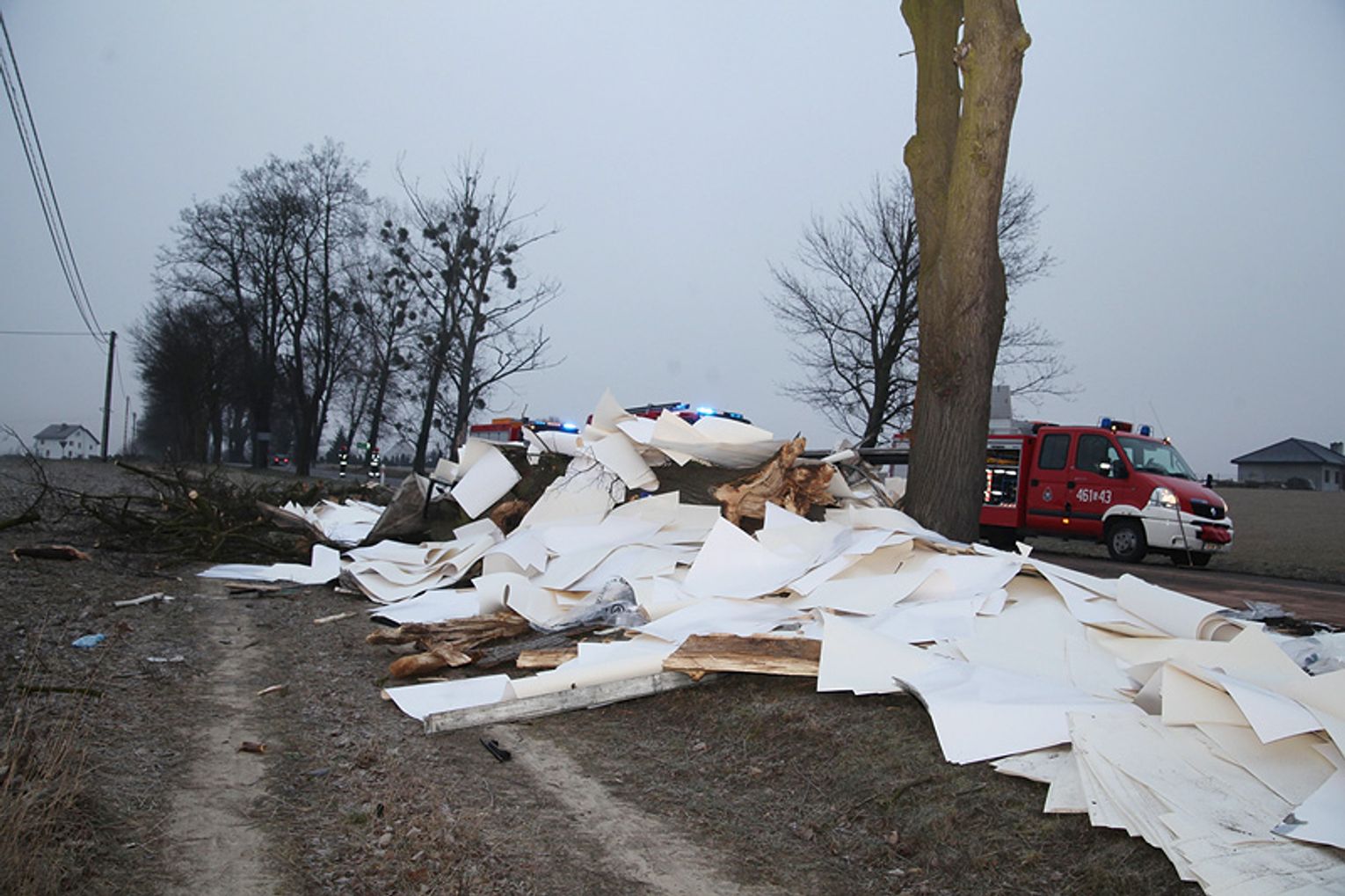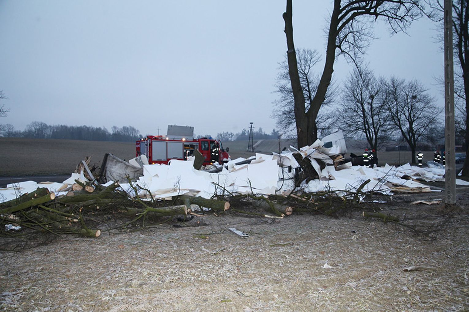 Na miejscu zdarzenia bardzo szybko pojawili się strażacy z OSP w Gardei. To, co zobaczyli mogło zmrozić krew w żyłach. Leżąca obok jezdni ścięta, gruba lipa, zmiażdżona kabina TIR-a i porozrzucany w miejscu wypadku papier. Uszkodzony pojazd stał natomiast w poprzek jezdni całkowicie blokując ruch.