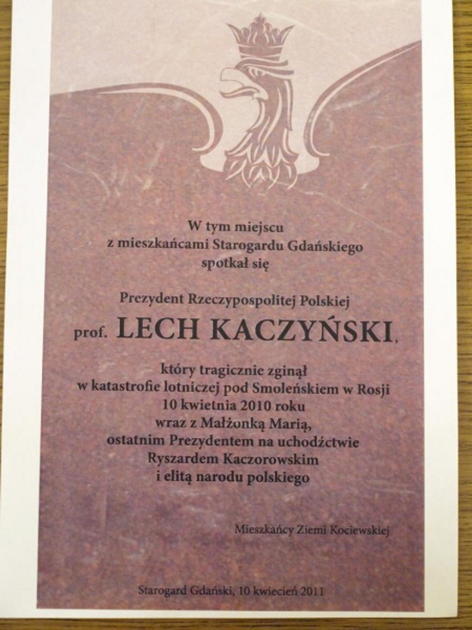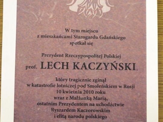 Co nie spodobało się radnemu? Przede wszystkim to, że na tablicy zaproponowanej przez UM znalazło się jedynie wspomnienie wizyty prezydenta. Oprócz tego zaproponował, by wykonano ją w wymiarach 76/112 cm takich samych jak znajdująca się na północnej ścianie Ratusza tablica upamiętniająca Konfederatów Barskich, a nie 75/45 cm jak zaproponował Urząd Miasta. Tablica najprawdopodobniej zostanie przytwierdzona po prawej stronie frontowych drzwi budynku, dokładnie 10 kwietnia, w pierwszą rocznicę tragedii. Uroczystościom towarzyszyć ma Msza Polowa na starogardzkim Rynku.