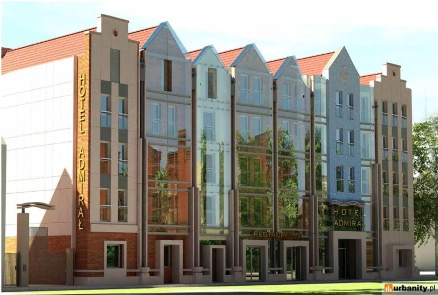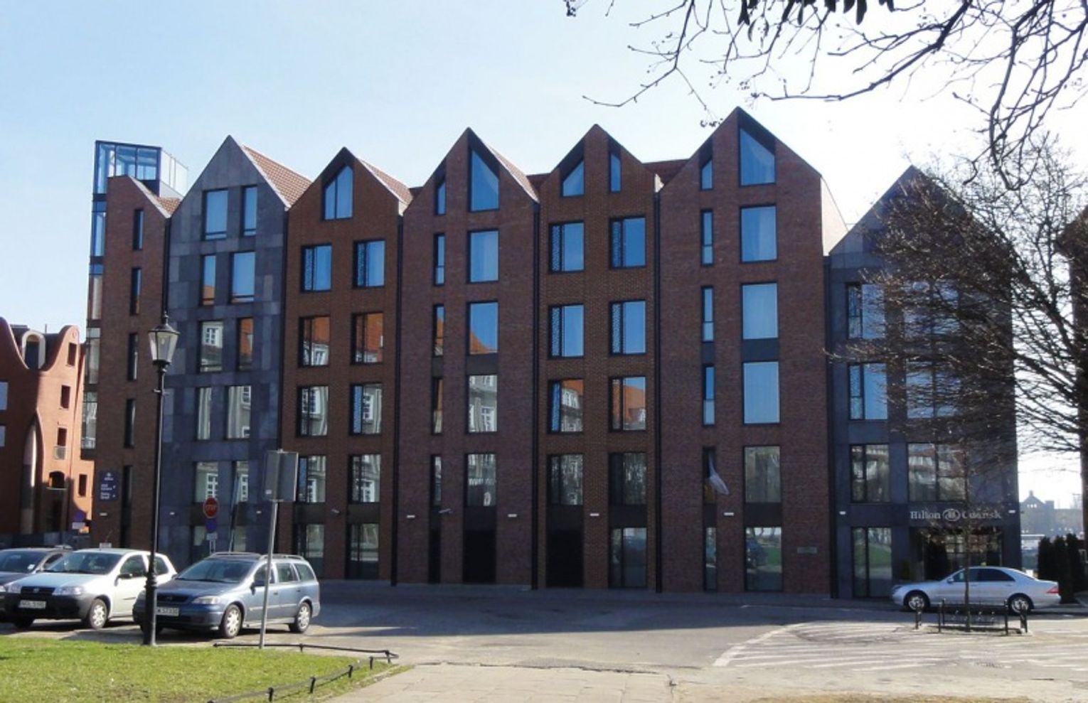 Najjaskrawszym współczesnym przykładem jest hotel „Hilton”. Proszę dobrze zrozumieć: nie mamy nic przeciwko hotelowi, dobrze, że jest i służy ludziom. Chodzi o architekturę. Od strony ul. Wartkiej jest wprawdzie co najmniej o jedną kondygnację za wysoki, przez co przygniata optycznie basztę Łabędź, ale kształt architektoniczny mógłby być do przyjęcia. Znacznie gorzej wygląda elewacja od Targu Rybnego. Opinia jest powszechna: te pseudo-kamieniczki, o fasadach uproszczonych do granic prymitywizmu, wyraźnie się cenionemu poza tym autorowi nie udały. Słabe zróżnicowanie sprawia, że odbieramy je jako jeden blok o sztucznych kształtach. Kontrasty kolorystyczne i fakturalne można by pochwalić, gdyby nie to, że odmienne ciemne fasady „ozdobiono” troszeczkę jaśniejszymi płytami w chaotycznym układzie. Z daleka wyglądają jak pochlapane błotem, z bliska rażą bezładem.