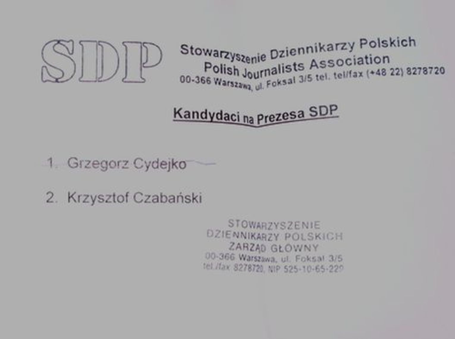 W pierwszej turze najmniej głosów uzyskał Kłopotowski, następnie wycofał się Truszczyński. Decydujące starcie odbyło się między Cydejko a Czabańskim. Jednakże nie udało się wybrać nowych władz. Regulamin wyboru prezesa SDP został niefortunnie sformułowany - w efekcie wystąpił pat. Część delegatów w decydującej turze wyborów, gdy zostało dwóch kandydatów: Czabański i Cydejko wstrzymała się od głosowania i żaden z kandydatów nie uzyskał wymaganej większości. Mimo iż Krzysztof Czabański uzyskał najwięcej głosów (66 na 148 oddanych ważnych głosów), nie został przewodniczącym. Drugi z kandydatów Cydejko uzyskał 65 głosów. 17 delegatów przyblokowało wybór prezesa w I części zjazdu.