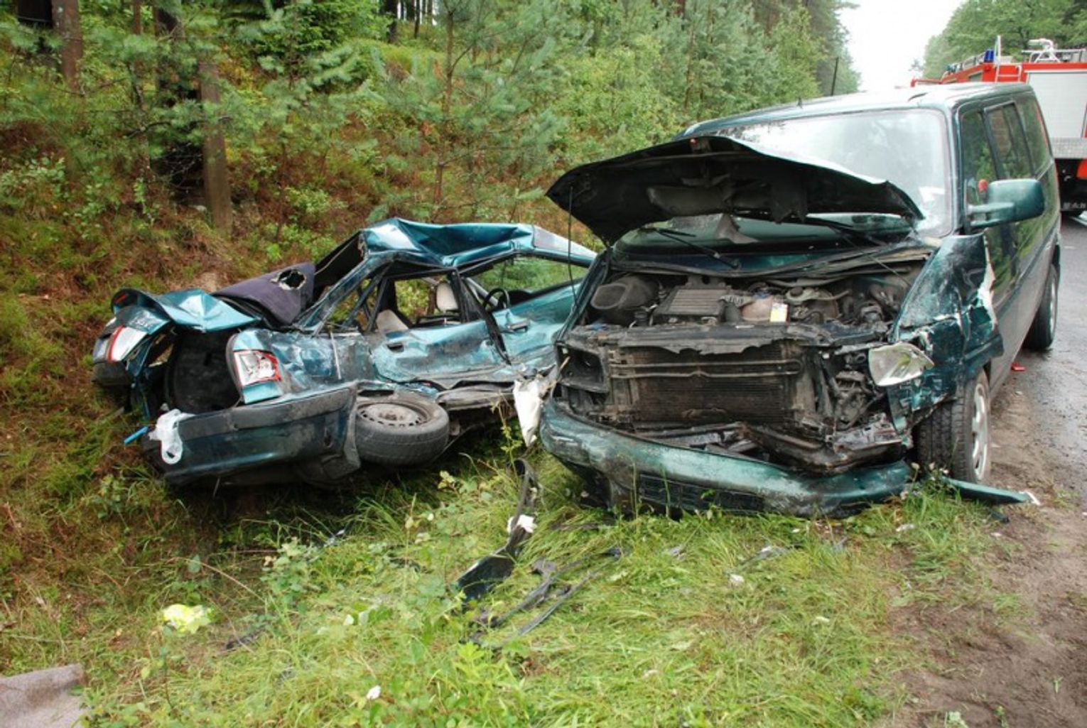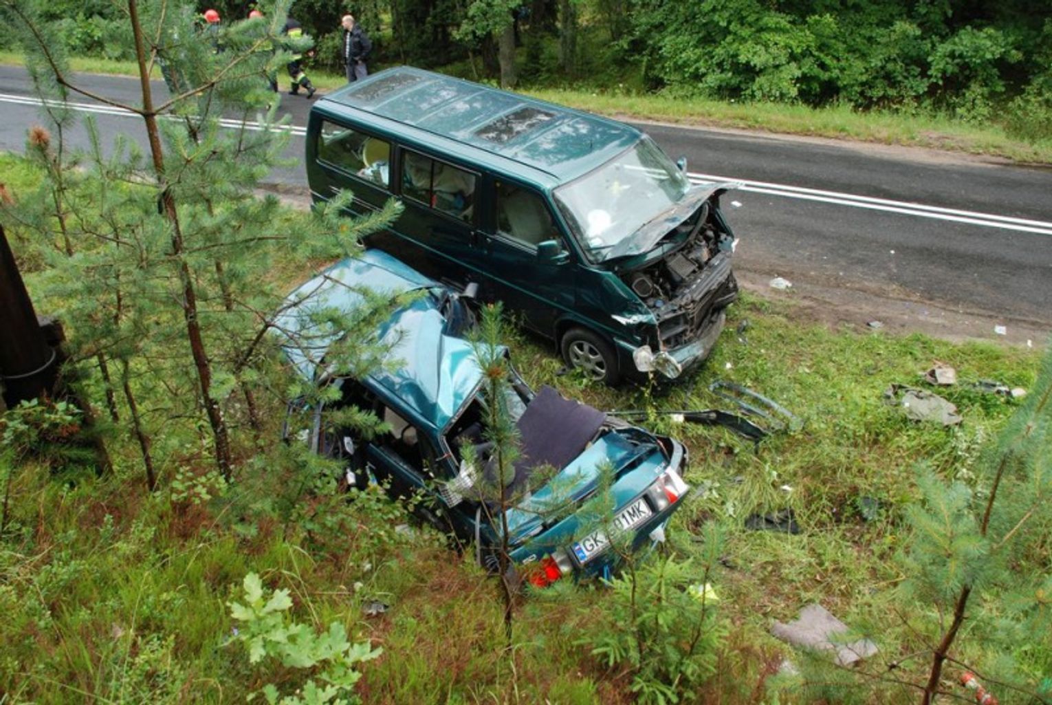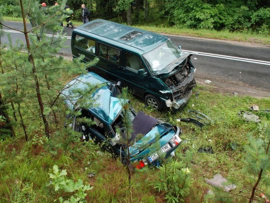 Okazało się, że zderzyły się audi i volkswagen caravelle. Policjanci wstępnie ustalili, że 29 – letni kierowca audi 80 - mieszkaniec Miastka, na zakręcie w lewo najprawdopodobniej nie dostosował prędkości do warunków drogowych i wpadł w poślizg. Rozpędzony samochód prawym bokiem uderzył w przód prawidłowo jadącego volkswagena. Pięć osób podróżujących busem (mieszkańcy woj. wielkopolskiego) w tym dwoje dzieci w wieku 3 i 15 miesięcy trafiło do szpitala. Do szpitala przewieziony został również kierowca audi.