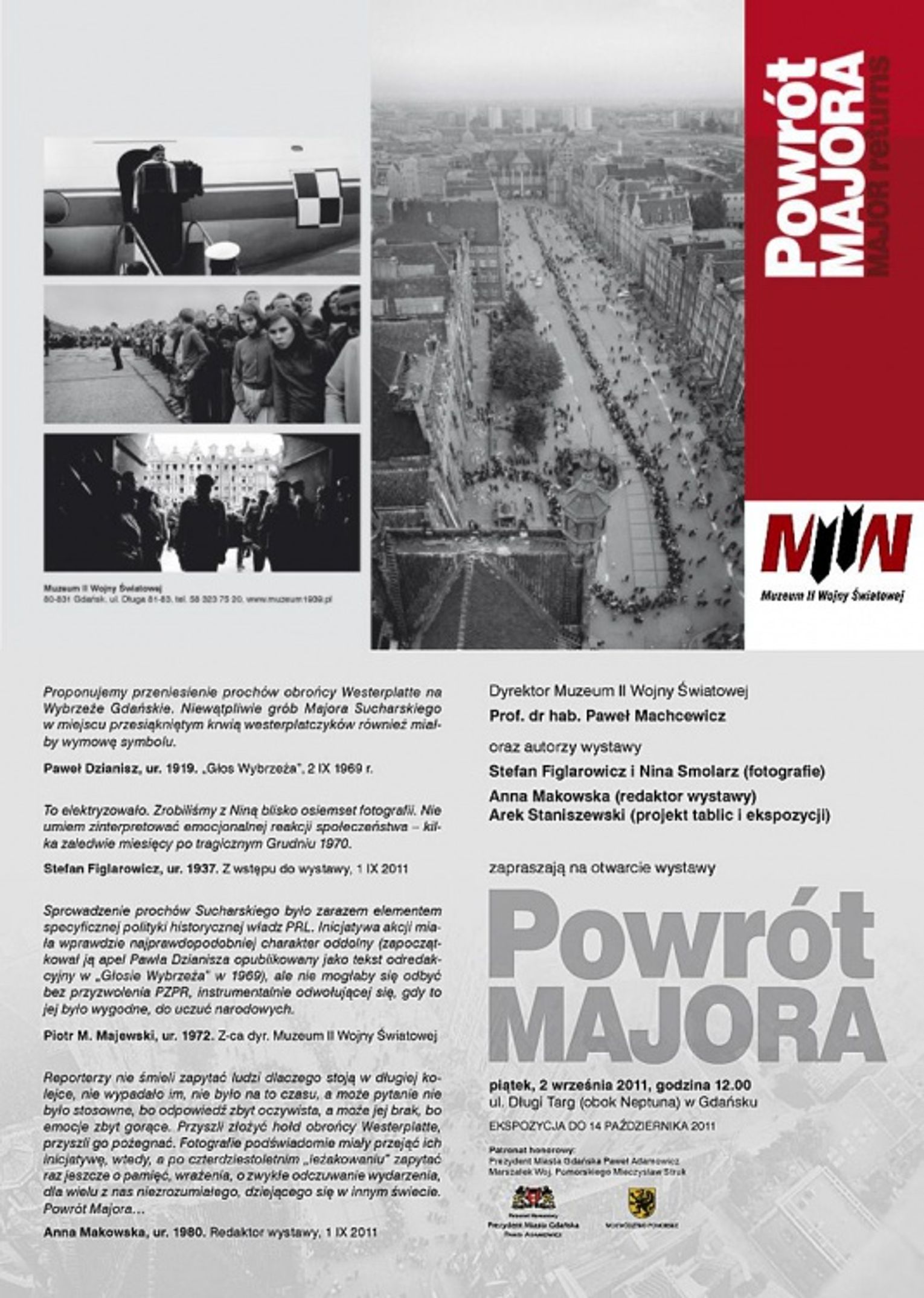 GDAŃSK. 121 fotografii Stefana Figlarowicza i Niny Smolarz oraz cytaty z prasy i wspomnienia złożyły się na plenerową wystawę fotograficzną „Powrót majora. Major returns”. To ekspozycja – reportaż, dokument, ukazująca sprowadzenie szczątków majora Henryka Sucharskiego - dowódcy obrony Westerplatte - na Wybrzeże Gdańskie w 1971 r.