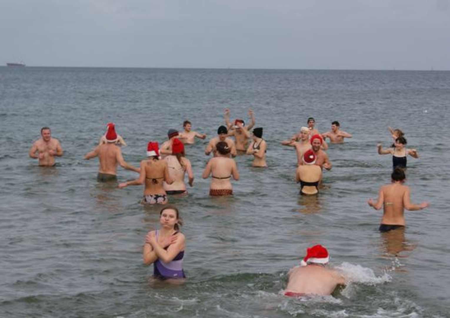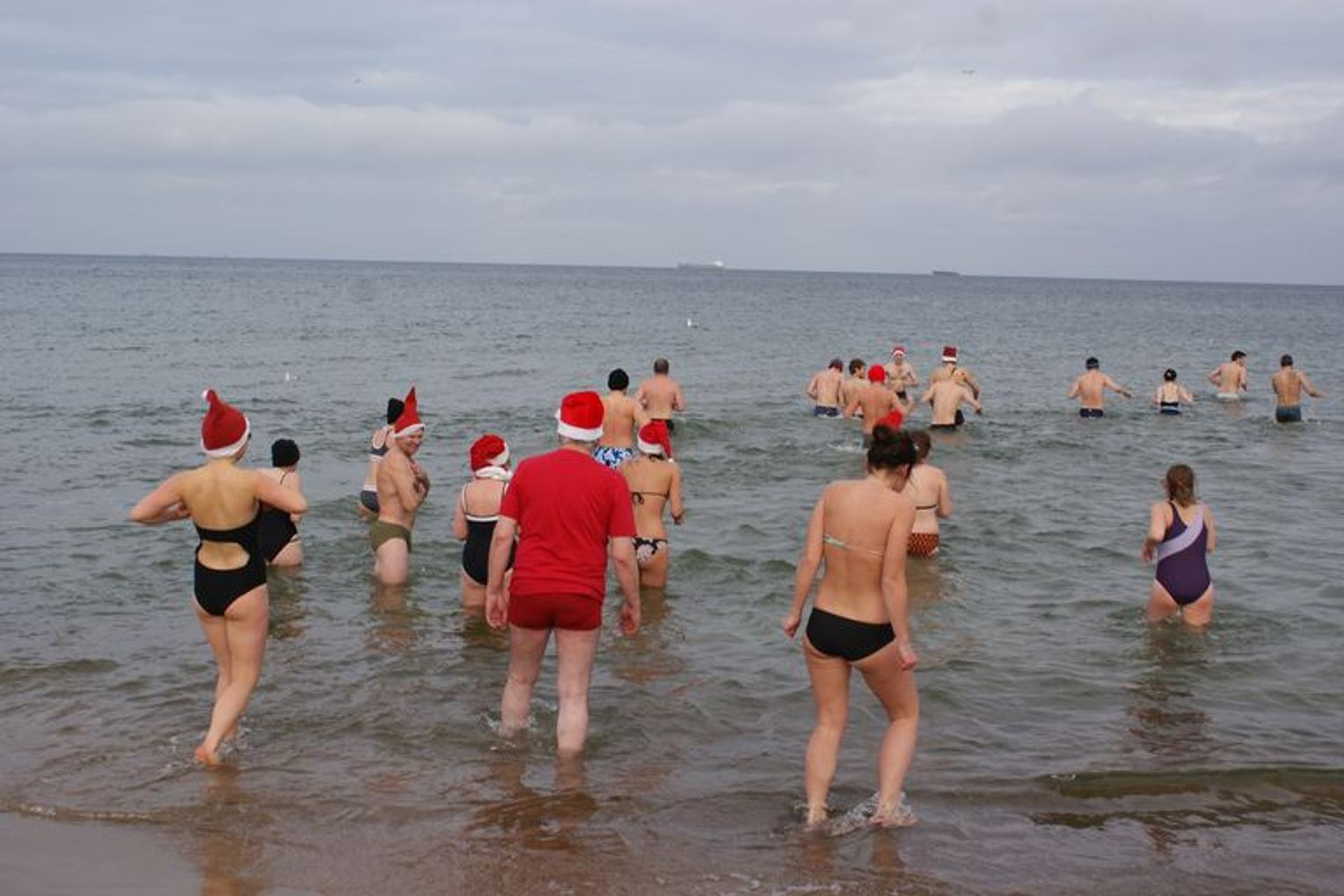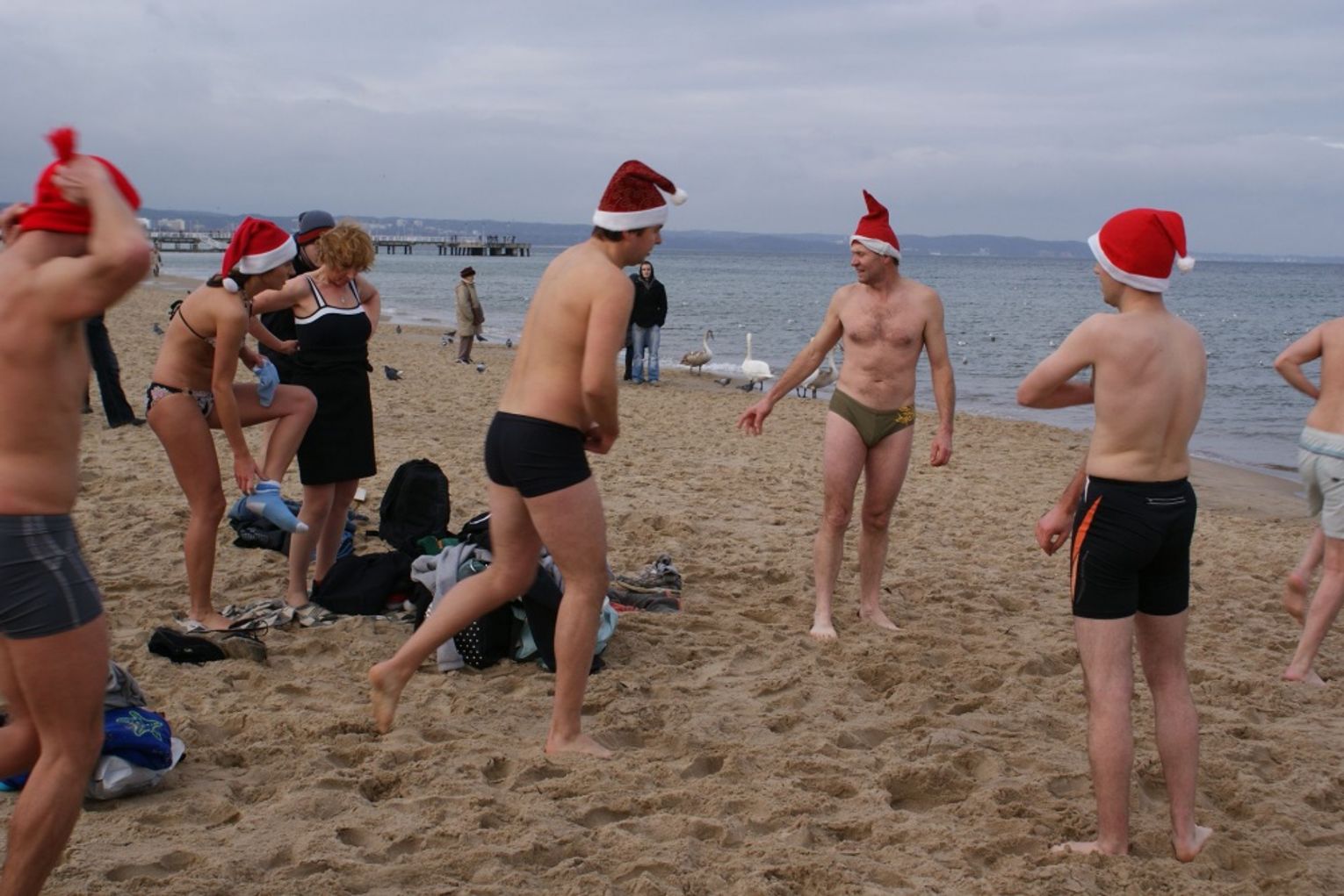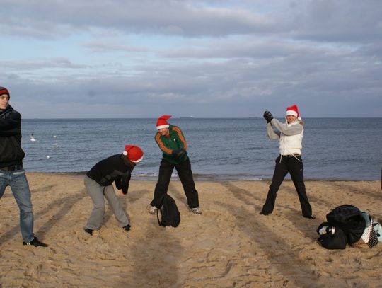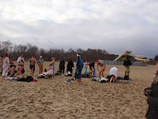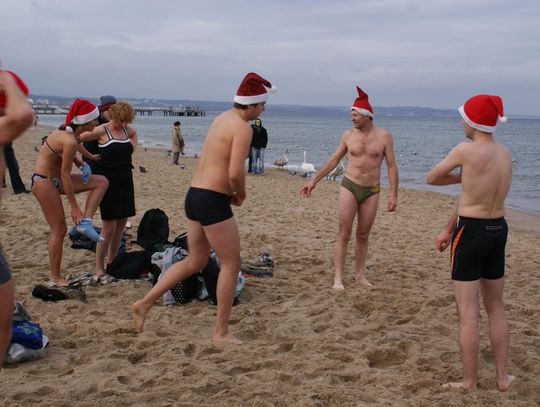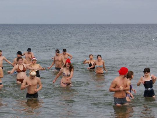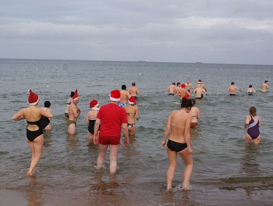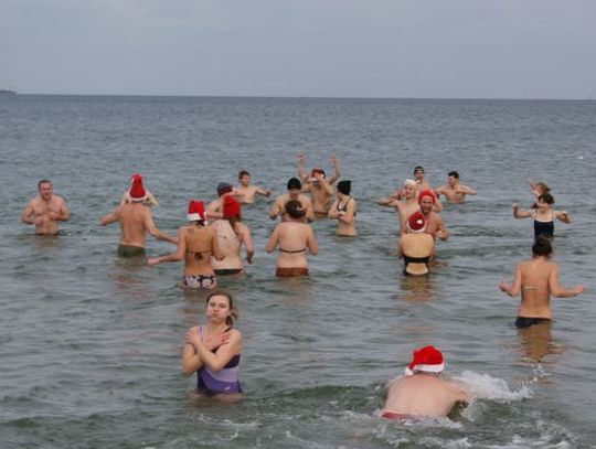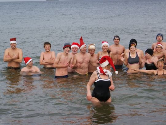 GDAŃSK. Ponad 35 osób kąpało się dzisiaj w południe w morza. Co niedzielę o godz. 12.15 spotykają się na plaży w Brzeźnie i po rozgrzewce kąpią się w lodowatej wodzie Bałtyku. Dzisiaj kąpali się w czapkach mikołajowych.