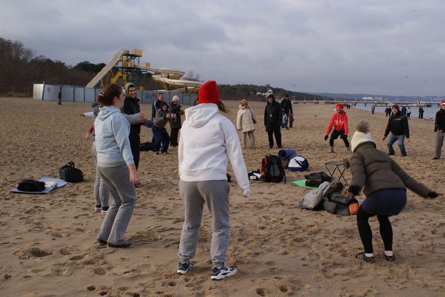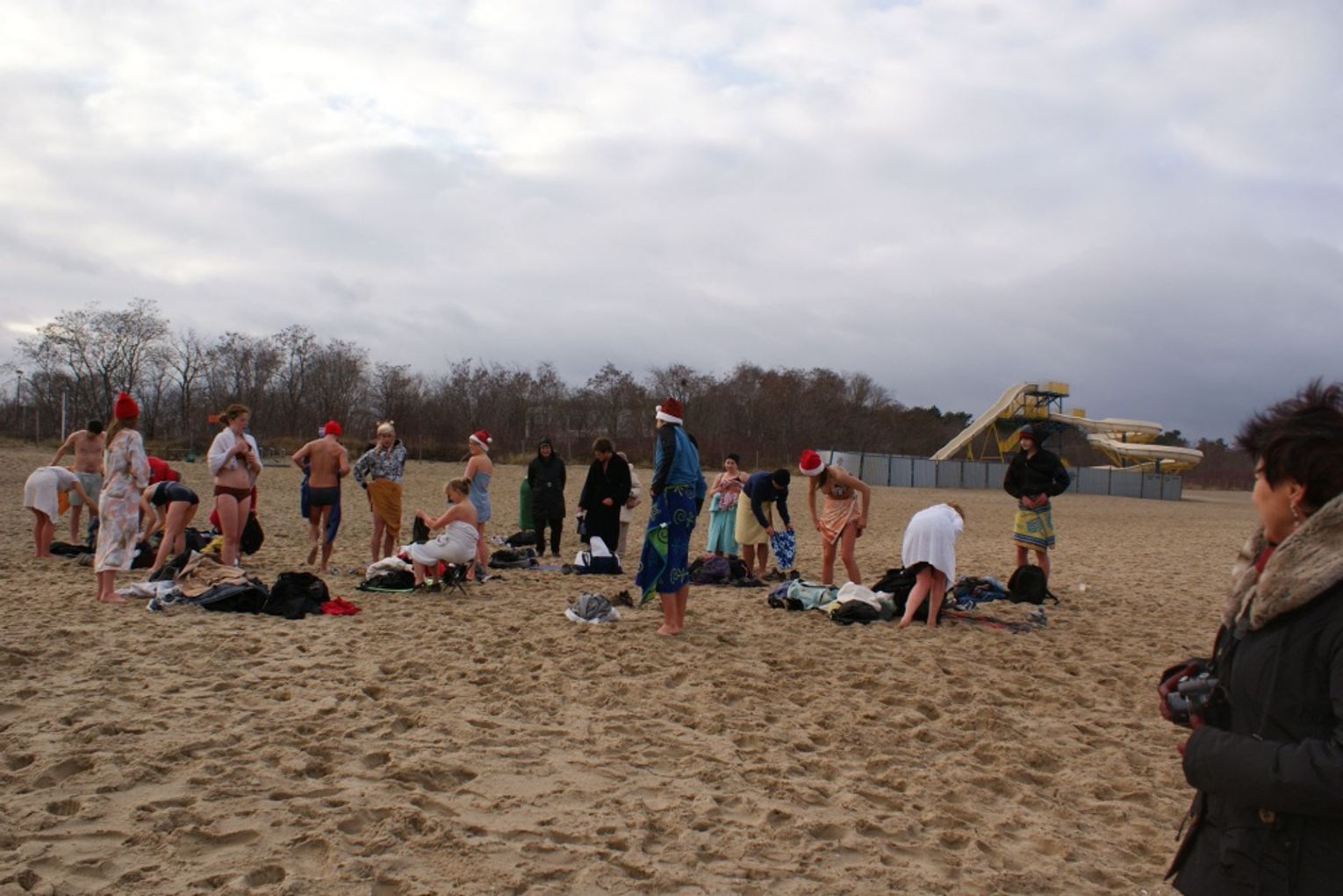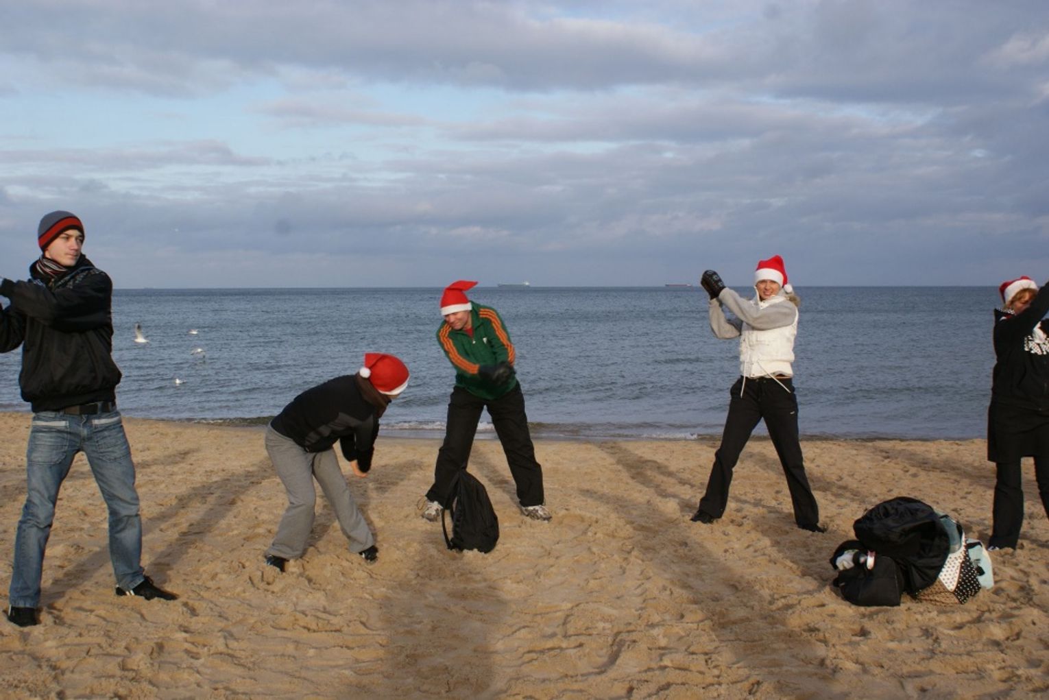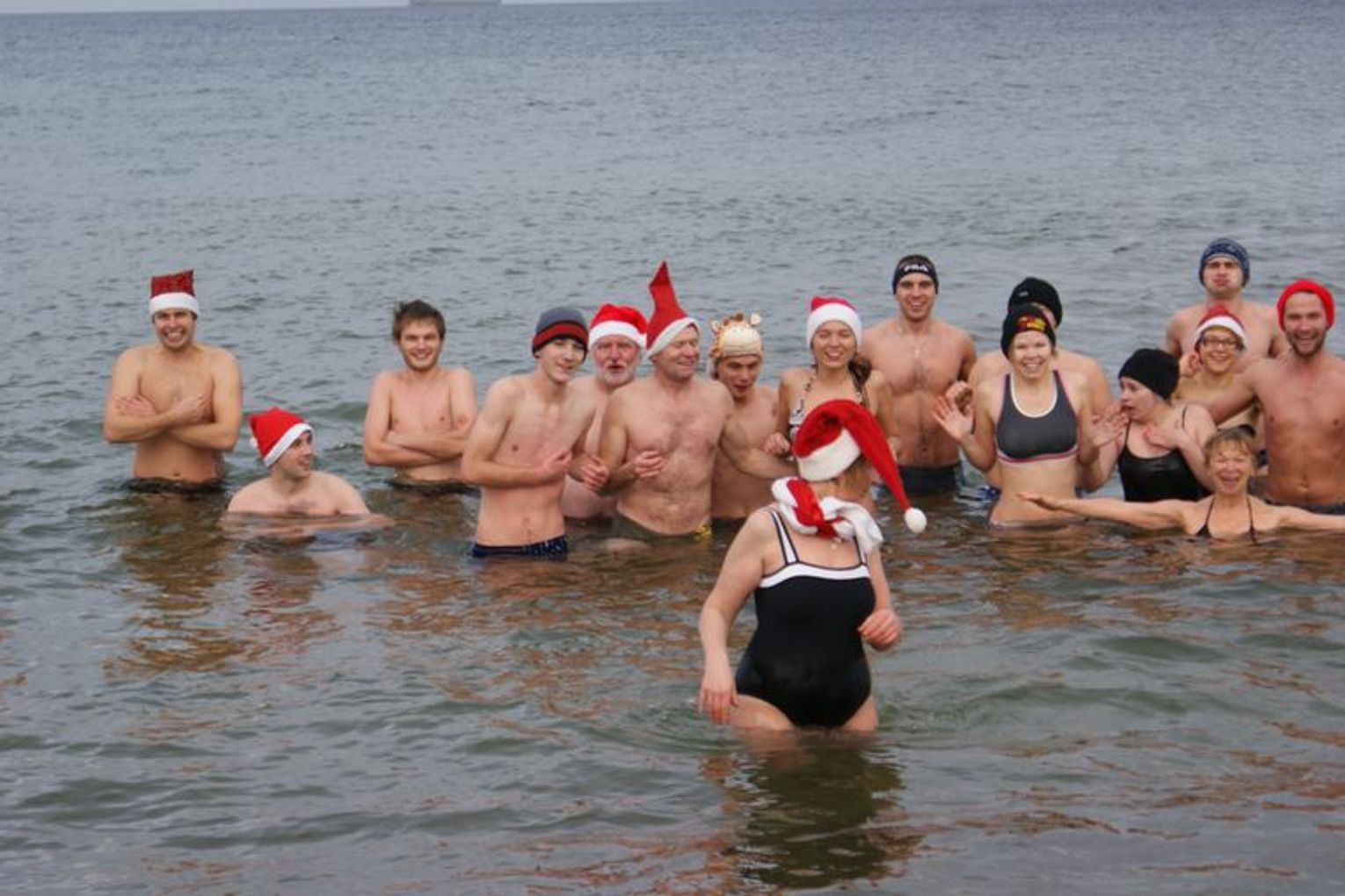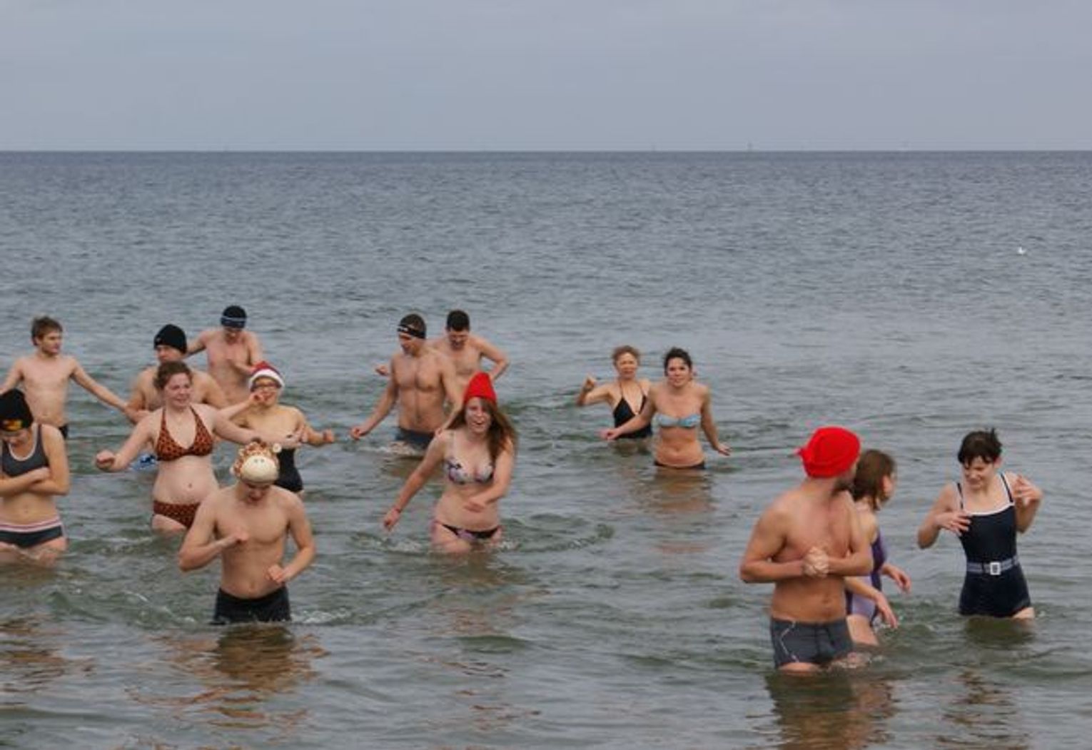 GDAŃSK. Ponad 35 osób kąpało się dzisiaj w południe w morza. Co niedzielę o godz. 12.15 spotykają się na plaży w Brzeźnie i po rozgrzewce kąpią się w lodowatej wodzie Bałtyku. Dzisiaj kąpali się w czapkach mikołajowych.