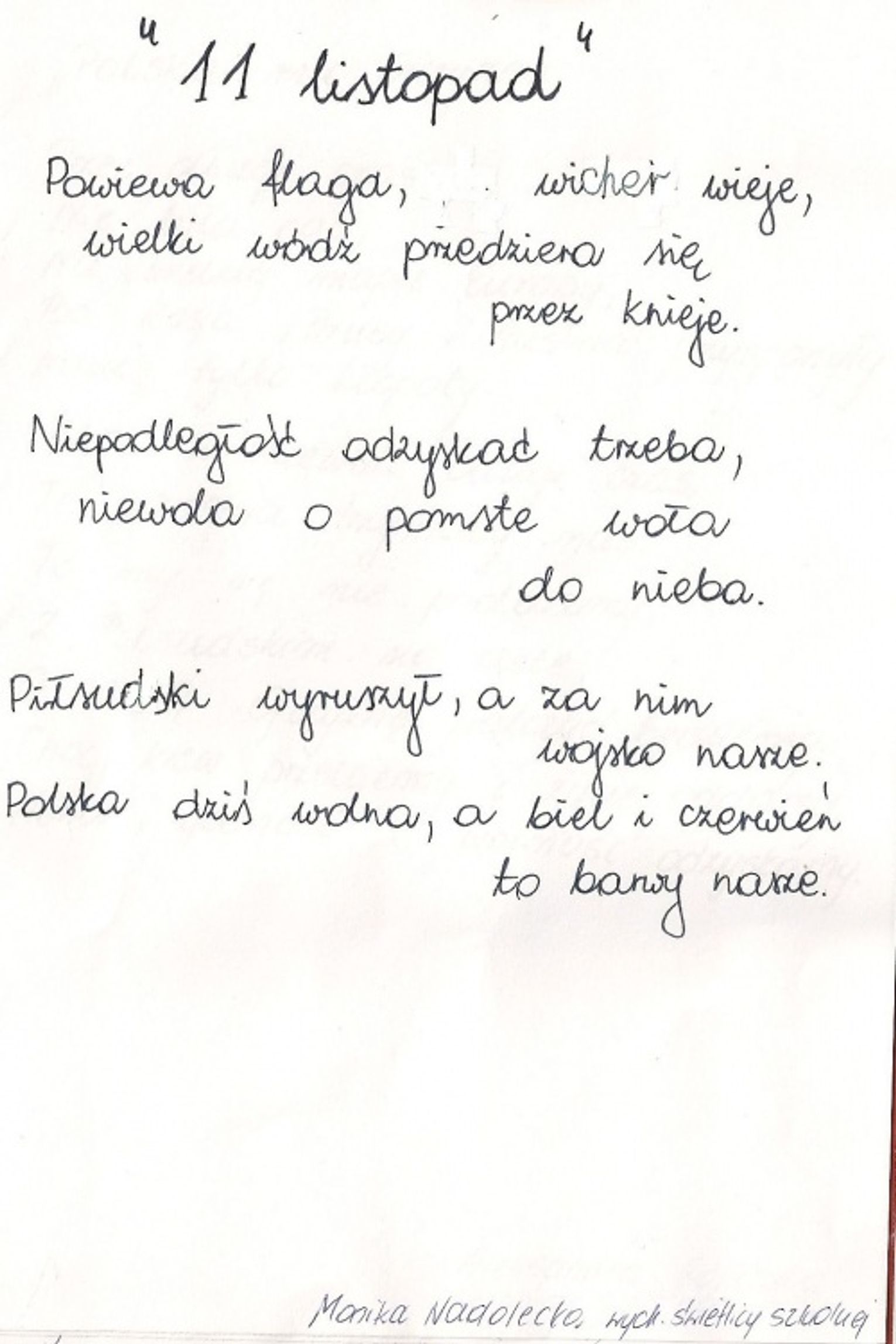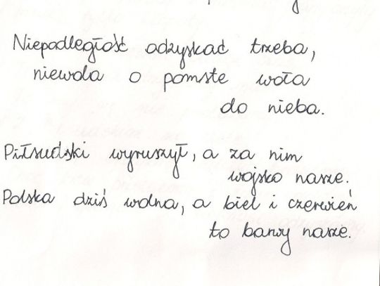 Poniżej publikujemy niektóre prace z różnych grup wiekowych. Wszystkim gratulujemy i dziękujemy za udział w tej specyficznej lekcji patriotyzmu.