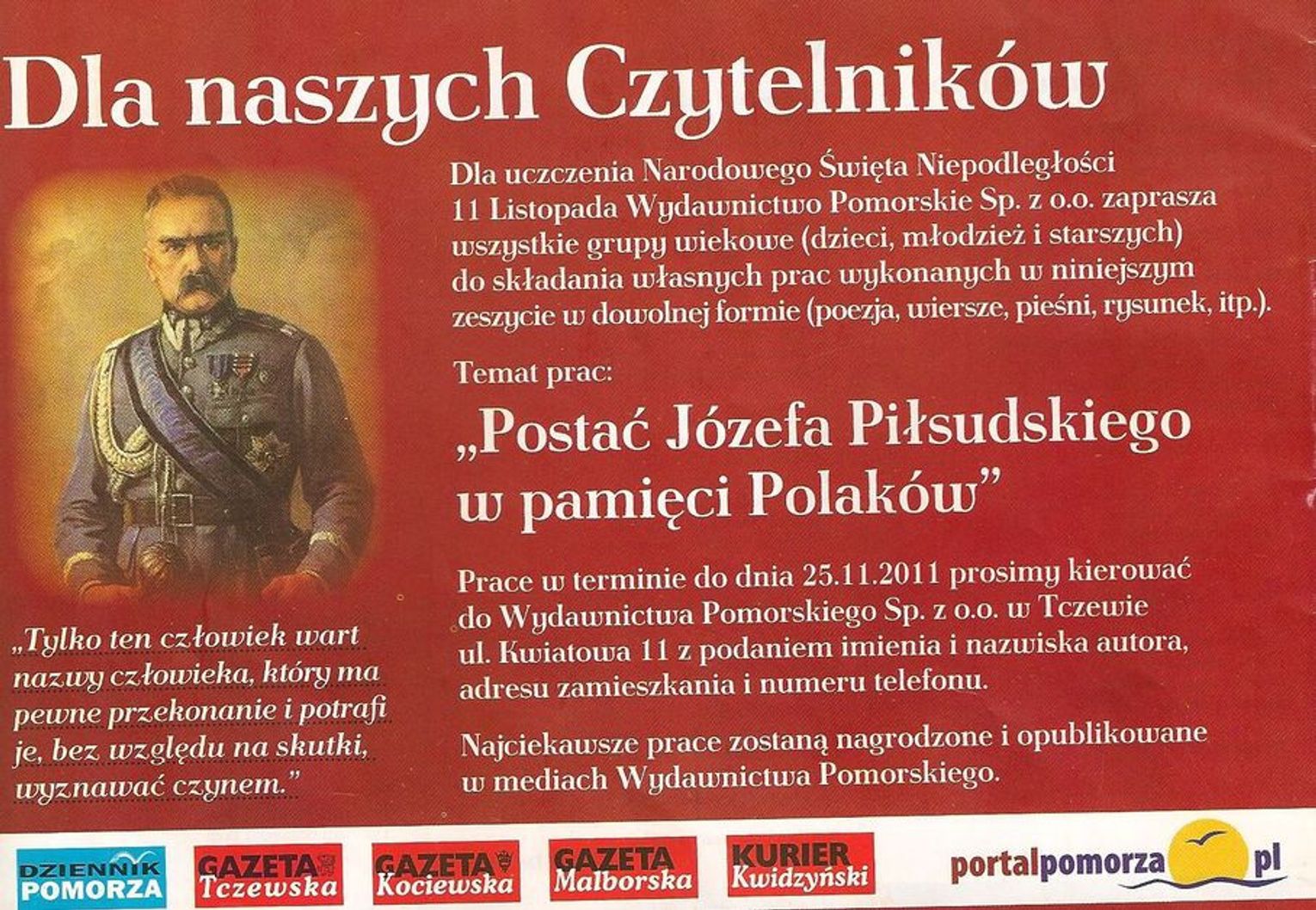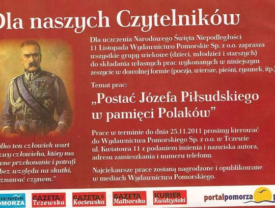 Dla uczczenia Narodowego Święta Niepodległości 11 Listopada Wydawnictwo Pomorskie (wydawca tygodników lokalnych i Portalu Pomorza) zaprosiło dzieci, młodzież i starszych do wykonania prac w załączony do tygodników zeszycie. Oddźwięk – przekazane do Redakcji prace – przeszły najśmielsze oczekiwania. Szczególnie młodzi ludzie – dzieci i uczniowie - wykazali się pomysłami twórczymi (rysunki, wiersze, refleksje).