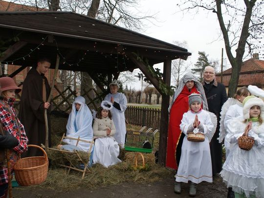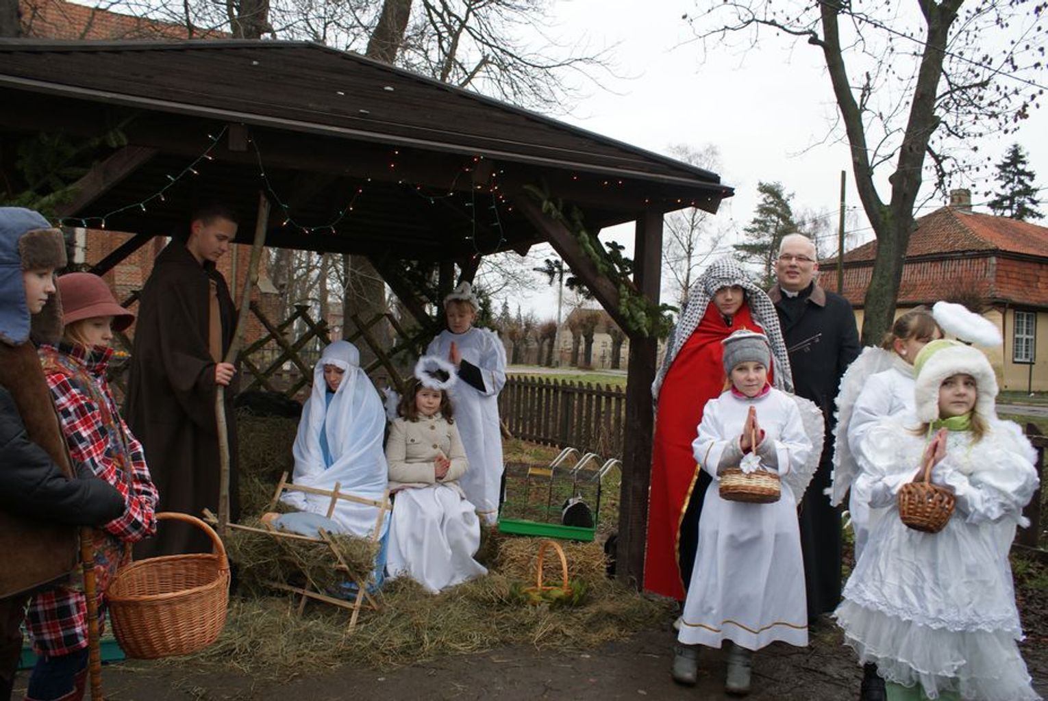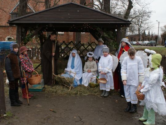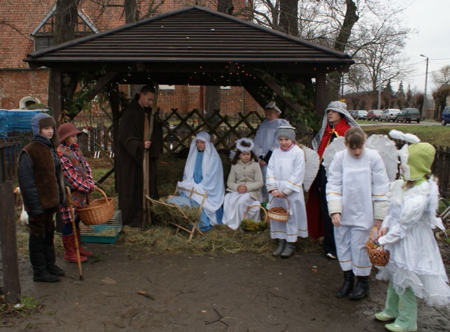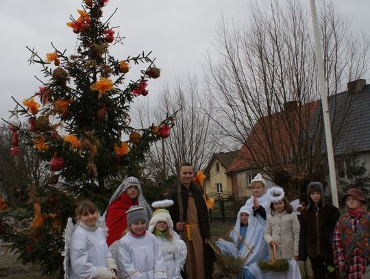 Na parafian wychodzących z kościoła p.w. Św. Apostołów Piotra i Pawła czekała niespodzianka. Grupa dzieci i młodzieży w sąsiadującej ze świątynią altanie ozdobionej kolorowymi światełkami, gałązkami choinki i sianem, zainscenizowała żywy obraz niczym przeniesiony z betlejemskiej stajenki. Wszyscy w stosownych strojach stanowili malowniczą grupę, której towarzyszyły żywe zwierzęta – koza, króliki, gęś i kury. Nastrój podkreślały kolędy odtwarzane z płyty, ale do wspólnego ich śpiewania chętnie włączali się licznie zebrani widzowie. Wśród publiczności pojawiły się aniołki i pastuszkowie, częstujący obecnych cukierkami i pierniczkami. Podziękowaniem za wzruszającą scenę były burzliwe brawa i dziesiątki zdjęć wykonywanych aparatami fotograficznymi i telefonami komórkowymi. Później młodzi artyści przeszli w barwnym orszaku przez wieś pod pamiątkowy Kamień 700-lecia. Tam kilka dni wcześniej została ustawiona wielka choinka. Udekorowano ją setkami lampek i ozdobami z naturalnych materiałów, wykonanymi w ramach projektu podczas warsztatów.