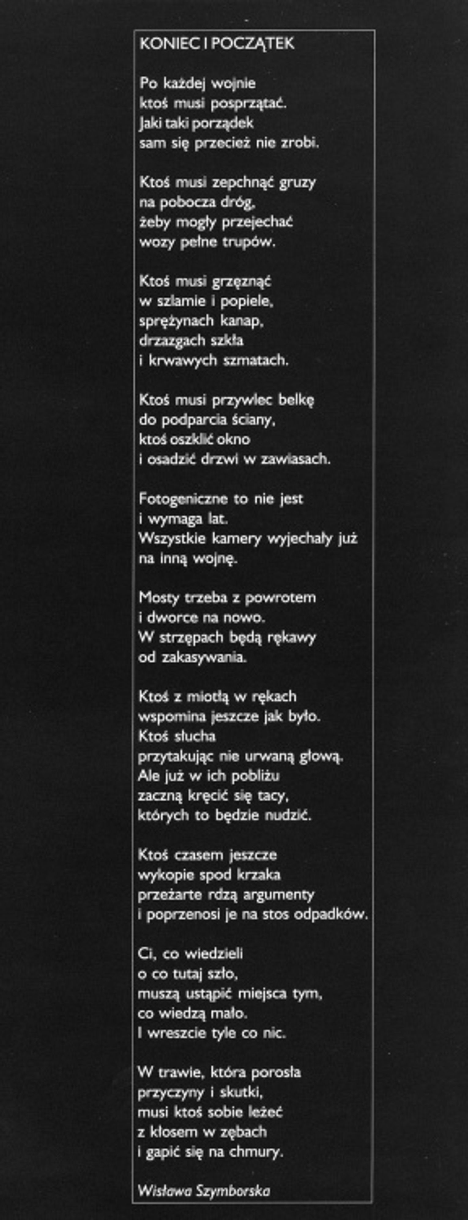 KONIEC I POCZĄTEK. GDAŃSK 1945-1955, jako motto obu wydarzeń wykorzystaliśmy, wypatrzony przez Nelę wiersz Wisławy Szymborskiej.