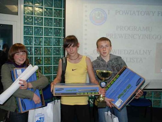 Nieco niżej na podium stanęła drużyna z gimnazjum w Rywałdzie, a na pozycji 3 uplasowali się uczniowie z gimnazjum w Pogódkach. Tuż poza podium znaleźli się uczniowie z gimnazjum w Zblewie i gimnazjum w Suminie. A walczyć było naprawdę o co. Można było wygrać m. in. odtwarzacze DVD, odtwarzacze MP3, telefony komórkowe, pamięci przenośne, książki, głośniki komputerowe i wiele innych wspaniałych wartościowych rzeczy.