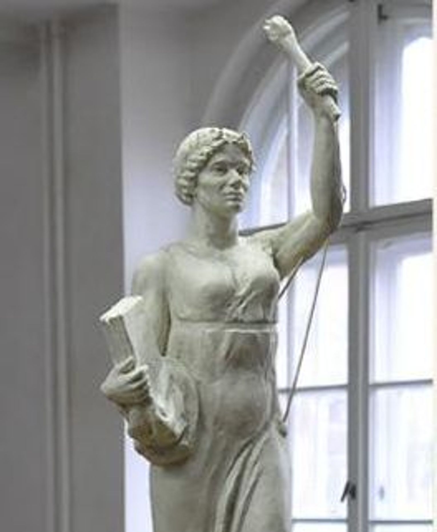 Na szczycie wieży stała figura, trzymająca w opuszczonej prawicy otwartą księgę, a we wzniesionej nad głową lewej ręce kaganek, z którego wychodził w górę płomień. Atrybuty figury pozwalają interpretować ją jako Naukę.