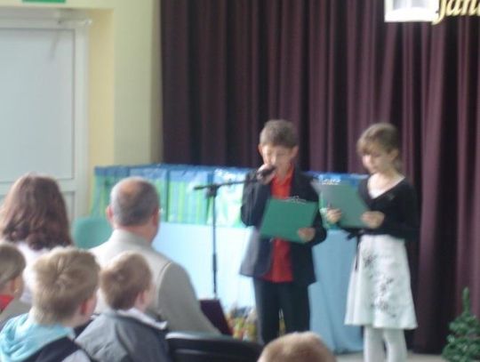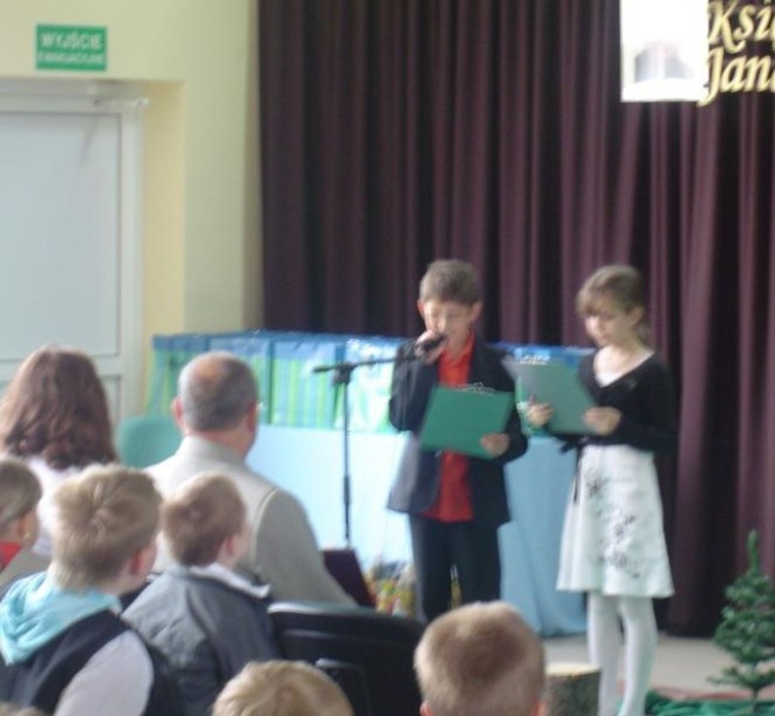 Dyrektor Kazimierz Bagnucki, powitał gości w szkolnej auli, życząc wszystkim dzieciom wszelkiej pomyślności i spełnienia marzeń z okazji ich uroczystości. Za sceną, na której odbywały się występy, dostrzec można było portret Ks. Jana Twardowskiego. Kazimierz Bagnucki, czytając wiersze Twardowskiego, przypomniał osobom będącym na auli o mądrości i inteligencji wybitnego Polaka.