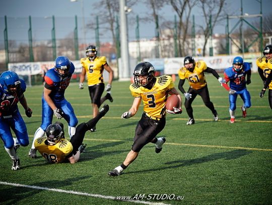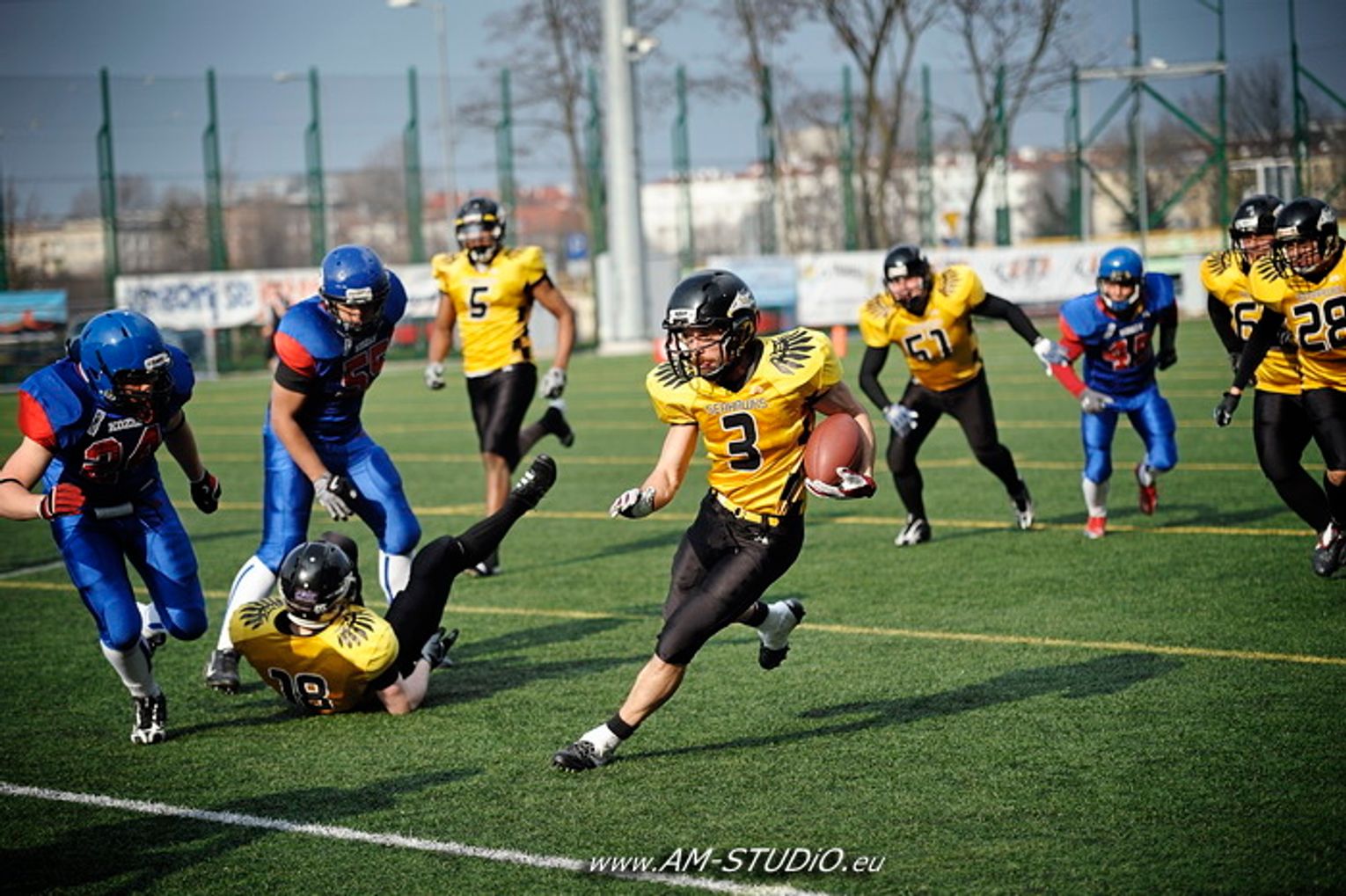 W ostatniej kolejce sezonu zasadniczego Topligi, Kozły Poznań stoją przed szansą wywalczenia czwartego, premiowanego awansem do play-off miejsca w tabeli rozgrywek. Aby tak się stało, muszą być spełnione dwa warunki - poznaniacy muszą pokonać lidera rozgrywek a AZS Silesia Rebels muszą polec w Warszawie, w meczu z Eagles. Wielkopolanie przegrali w niedzielę swój mecz z Orłami 7:38 tracąc aż trzy przyłożenia w pierwszej kwarcie spotkania. Dopiero drugą połowę gospodarze rozegrali na swoim nominalnym poziomie, zatrzymując kilka razy stołeczną ofensywę oraz zdobywając przyłożenie po ładnym przechwycie Jakuba Kowalczyka. Dobrze dysponowany był też Przemysław Gołębiewski, zastępujący na pozycji rozgrywającego leczącego kontuzję Bartosza Kimnesa. Kozły zagrały jednak dużo słabiej niż we wrocławskim thrillerze, który zakończył się jednopunktowym zwycięstwem faworyzowanych Devils. Brak amerykańskich zawodników w starciu z drużyną ze stolicy był bardzo widoczny, a praca zespołowa i ogromna ambicja nie wystarczyła by pokonać walczących o półfinał na własnym boisku gości. W poprzedniej kolejce Seahawks Gdynia ograli na własnym boisku Devils Wrocław. Dzięki temu efektownemu triumfowi Jastrzębie umocniły się na pierwszym miejscu w tabeli Topligi. Mają jednak o co walczyć w nadchodzącej konfrontacji, bo w przypadku porażki i zwycięstwa Eagles mogą spaść na drugie miejsce w rozgrywkach i w półfinale mierzyć się ponownie z Diabłami. Kluczem do zwycięstwa dla gdynian będą przede wszystkim koncentracja i chęć postawienia kropki nad "i". - Nie nazywał bym tego meczu formalnością. Kozły to doświadczona drużyna, która na pewno nie zamierza poddać się bez walki. Myślę, ze właśnie Devils po ostatnim meczu z drużyną z Poznania mogą być świetnym przykładem, ze nie należy nikogo lekceważyć. Na pewno wyjdziemy na boisko dobrze przygotowani i skoncentrowani - zapowiada Gaweł Pilachowski, fullback Seahawks Gdynia.