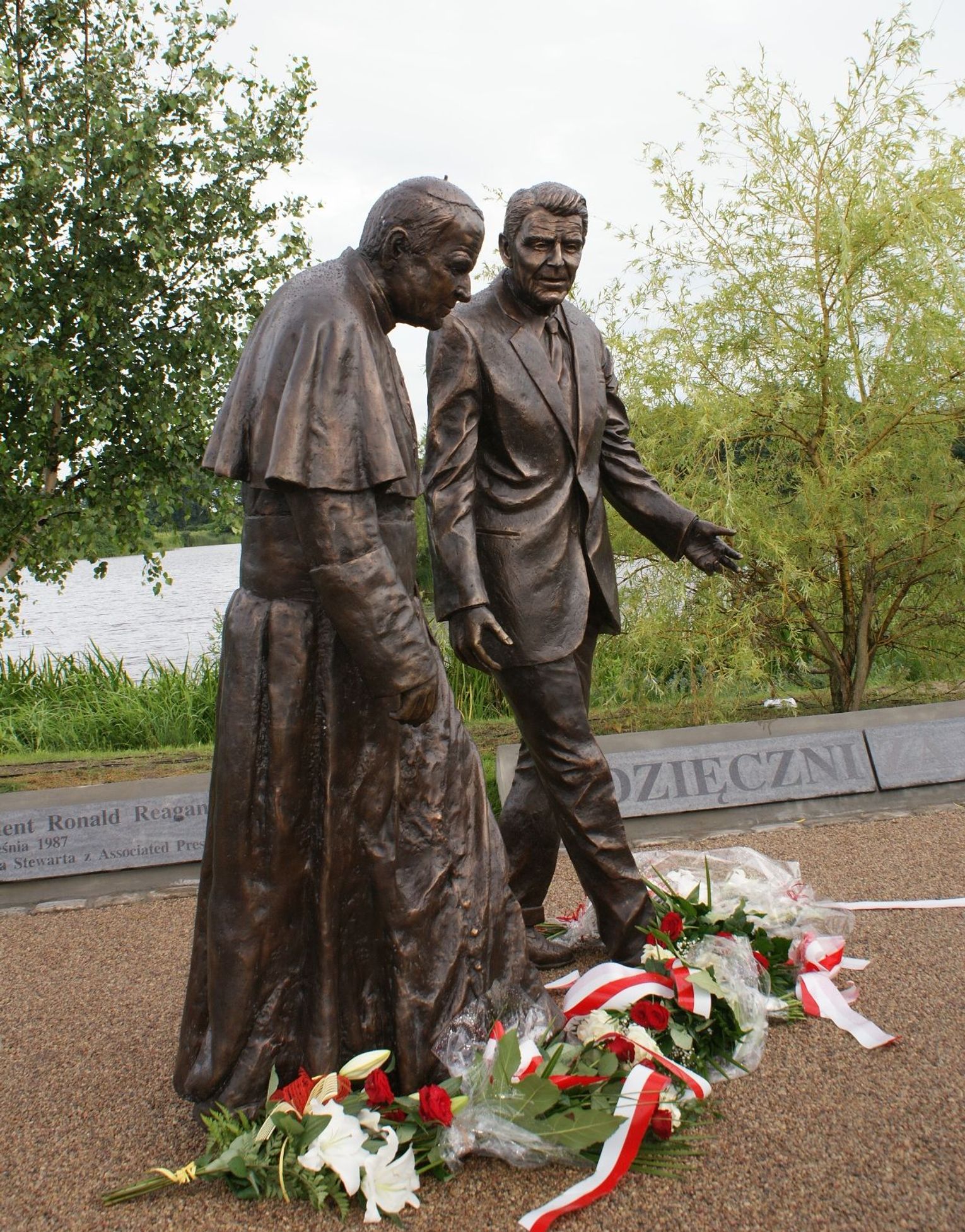 Pragnę podziękować panu prezydentowi Gdańska, który od początku popierał nasz pomysł i powiedział parę lat temu: "Miasto zrobi otoczenie a wy zbierzcie pieniądze na figury pomnika”. I tego stanowiska nie zmienił . Napisał nam nawet rekomendację aby ją dołączać do naszych pism kierowanych do firm. Szczególne podziękowanie kieruję do ks. abp Sławoja Leszka Głódzia za wyrażoną zgodę na budowę wspólnego pomnika Papieża Jana Pawła II i Prezydenta Ronalda Reagana. Dziękuję ks. infułatowi Stanisławowi Bogdanowiczowi za nadzór nad wykonaniem wiernej kopii pomnika ze zdjęcia. Dziękuję Bogusławowi Szycikowi i Stanisławowi Milewskiemu- młodym gdańskim rzeźbiarzom za solidne dzieło, które choć wykonane ze zdjęcia, to wymagało także talentu i wyobraźni. Dziękuję wszystkim sponsorom tym dużym i tym najmniejszym, którzy wpłacili niewielkie sumy z potrzeby serca. Spis wszystkich sponsorów umieściliśmy w specjalnym pojemniku i znajduje się przy fundamencie pomnika. Miasto i Kasy Krajowe SKOK pokryły przeważającą część kosztów pomnika i otoczeni. Za to chciałem podziękować w imieniu członków Stowarzyszenia Godność. Chciałbym podziękować wszystkim, którzy okazali życzliwość dla projektu tj. Radzie Miasta, pracownikom Referatu Kultury, Wydziału Architektury i Geodezji, Urzędowi Marszałkowskiemu. Dziękuję moim kolegom członkom Stowarzyszenia Godność, panom architektom prof. Szczepanowi Baumowi i Ryszardowi Grudzie, którzy opiekowali się projektem na wszystkich szczeblach jego realizacji. Dziękuję moim kolegom z Godności , którzy uwierzyli, że to zrobimy i solidnie mnie wspierali, są to: Andrzej Osipów, Andrzej Michałowski, Stanisław Fudakowski i Mieczysław Wędrowski i inni. Dziękuję Joannie Wojciechowicz, naszej przedstawicielce, która w dalekiej Ameryce informowała Amerykanów i Polonię o naszej inicjatywie. Dziękuję redaktorom ,,Dziennika Bałtyckiego”, pani Barbarze Szczepule i Arturowi Górskiemu za obiektywne artykuły o pomniku. Dziękuję pracownikom ZdiZ, którzy byli odpowiedzialni za realizację projektu a także za organizację tej uroczystości. Dziękuję firmie Drogomet, która robiła otoczenie pomnika a także pomagała nam w jego posadowieniu i zamocowaniu na fundamencie. Ten pomnik przekazujemy dziś gminie Gdańsk i jego mieszkańcom na pamiątkę trudnych czasów w jakich żyło nasze pokolenie. Jesteśmy przekonani. że pomnik będzie on szanowany przez wszystkich mieszkańców Gdańska.