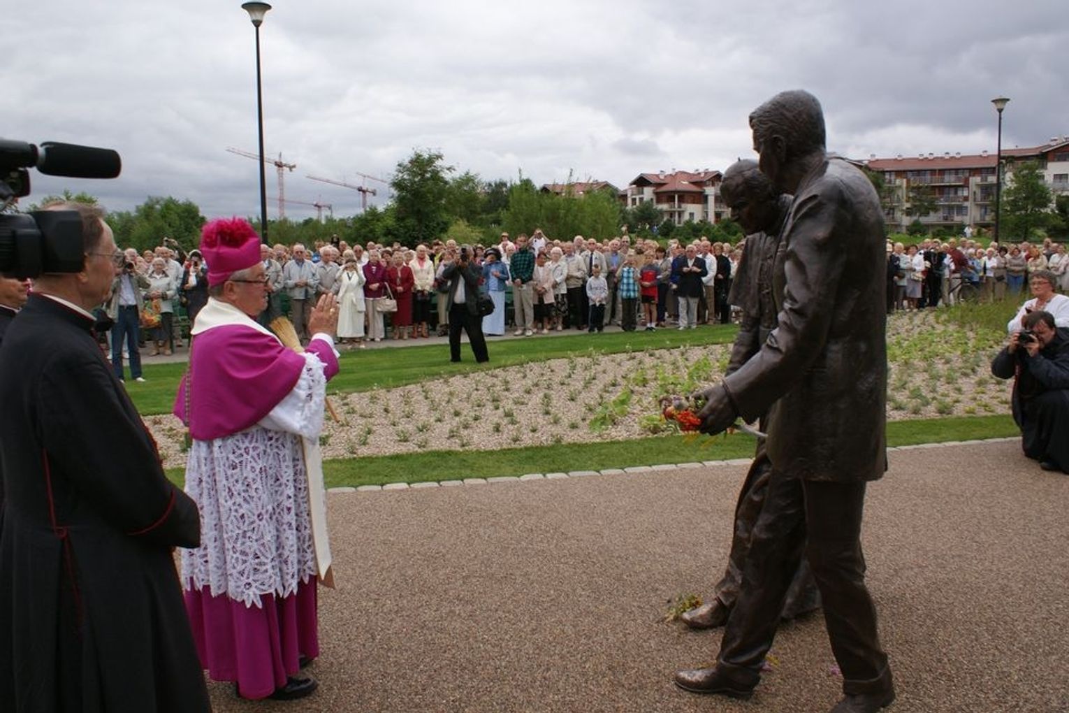 Natomiast o godz. 16:00 Metropolia Gdański abp. Sławoj Leszek Głódź oraz infułat Stanisław Bogdanowicz uroczyście poświęcili pomnik Jana Pawła II i prezydenta Ronalda Reagana. W uroczystości udział wzięło ponad tysiąc gdańszczan. Przybyli posłowie: Maciej Łopiński, Anna Fotyga i Andrzej Jaworski, przedstawciel głównego darczyńcy SKOK. Była także żona śp. Macieja Płażyńskiego, Krzysztof Wyszkowski, Tadeusz Fiszbach. Nie był obecny prezydent Gdańska Paweł Adamowicz.