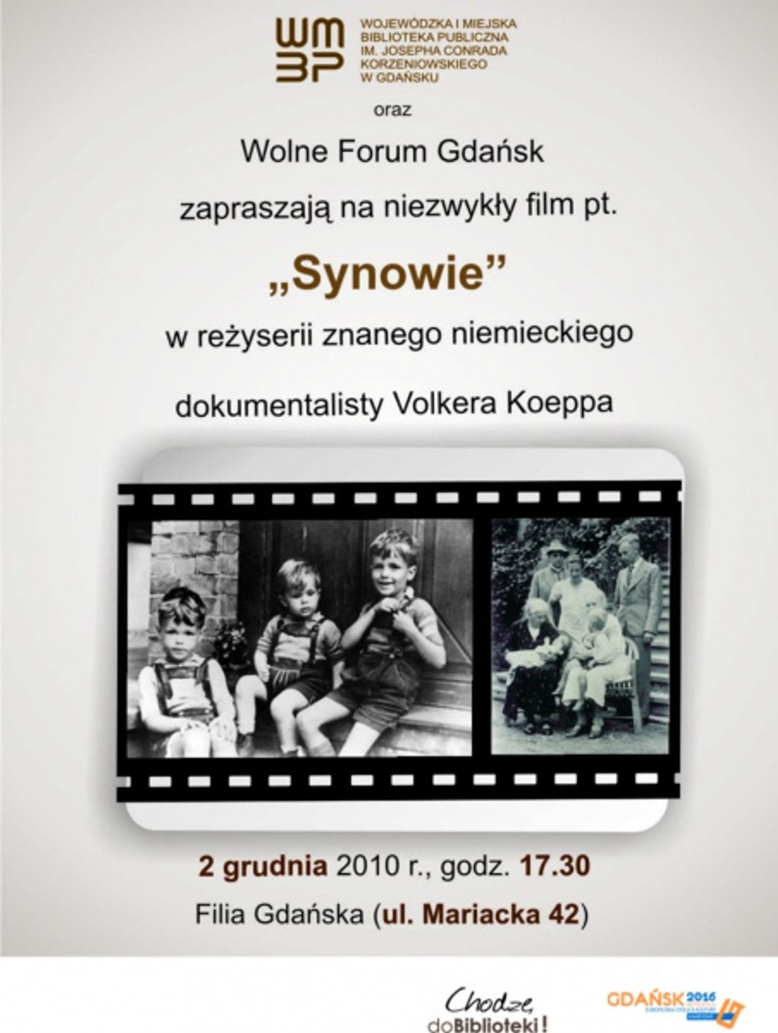 GDAŃSK. Projekcja filmu dokumentalnego pt. "Synowie" (Soehne) w reżyserii Volkera Koeppa odbędzie się w czwartek, 2 grudnia 2010 r. w Filii Gdańskiej przy ul. Mariackiej 42 w Gdańsku. Treścią obrazu są dzieje niemieckiej rodziny zamieszkałej przed wojną w Celbowie (Celbau) pod Gdańskiem wkręconej w machinę wojny.