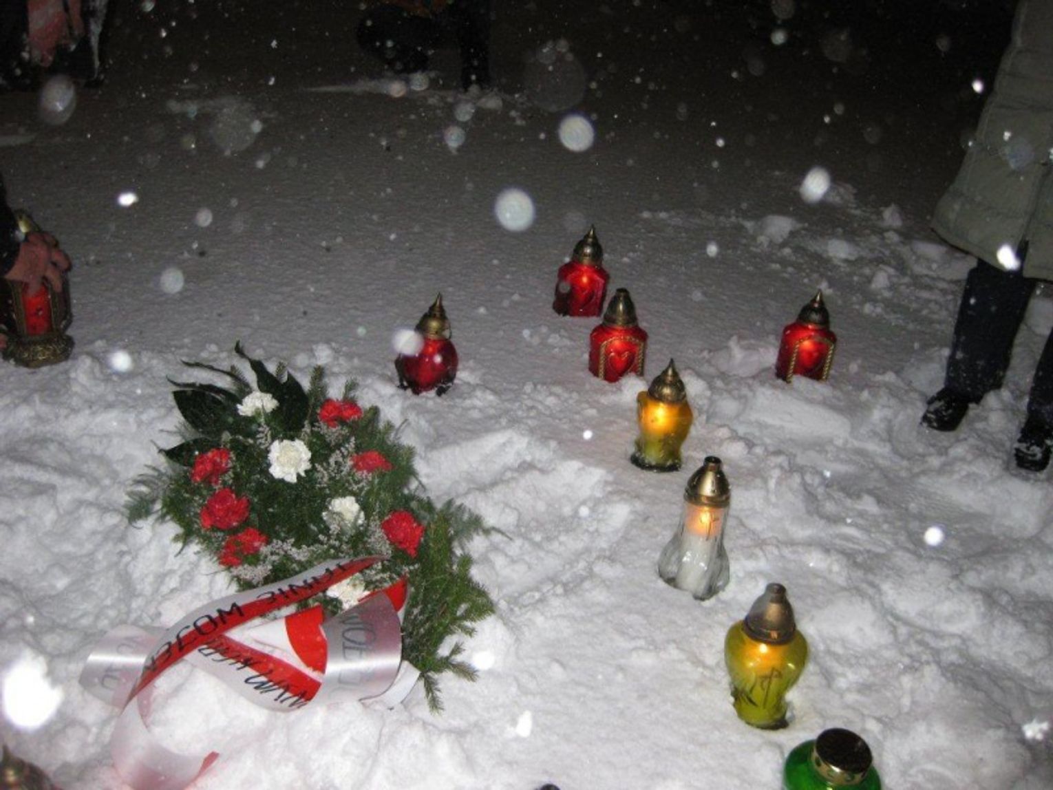 zapalenie zniczy pod tablicą pamiątkową na budynku b. PZPR