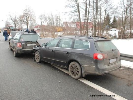 NOWY DWÓR. Na trasie nr 7 w m. Solnica, doszło do kolizji drogowej z udziałem siedmiu pojazdów. Kierujący i pasażerowie bez obrażeń. Ruch na drodze zablokowany przez kilka godzin.