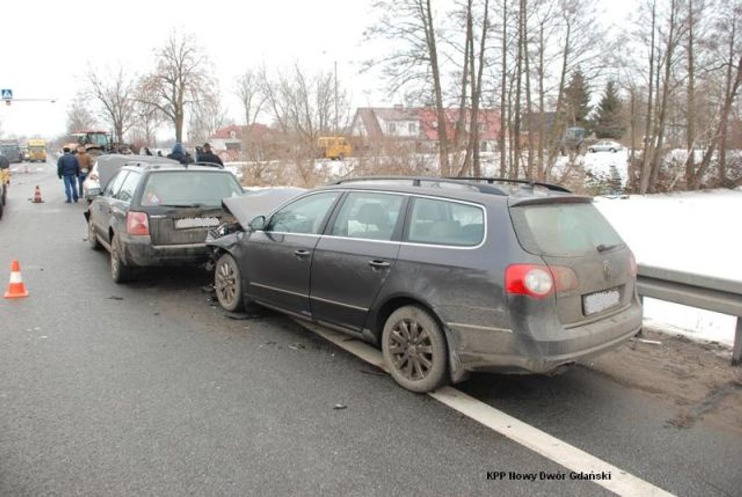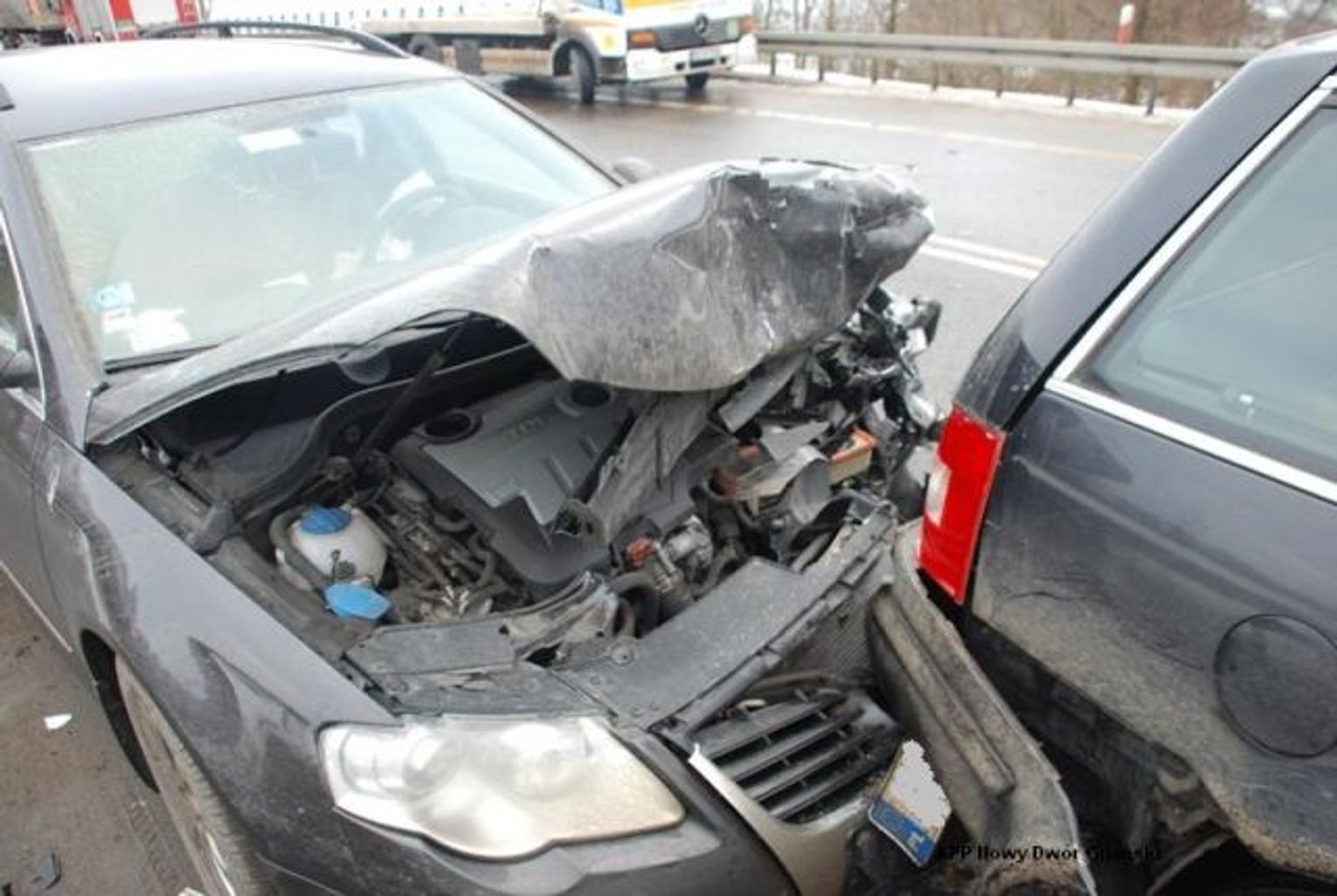 W tym samym czasie jadące z samochody zatrzymały się żeby uniknąć zderzenia czołowego z ciężarówką oraz udzielić pomocy uczestnikom tej kolizji. Jednak jadące za nimi trzy następne samochody nie wyhamowały na bardzo śliskiej nawierzchni i uderzyły kolejno w stojące przed nimi osobówki.