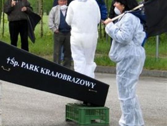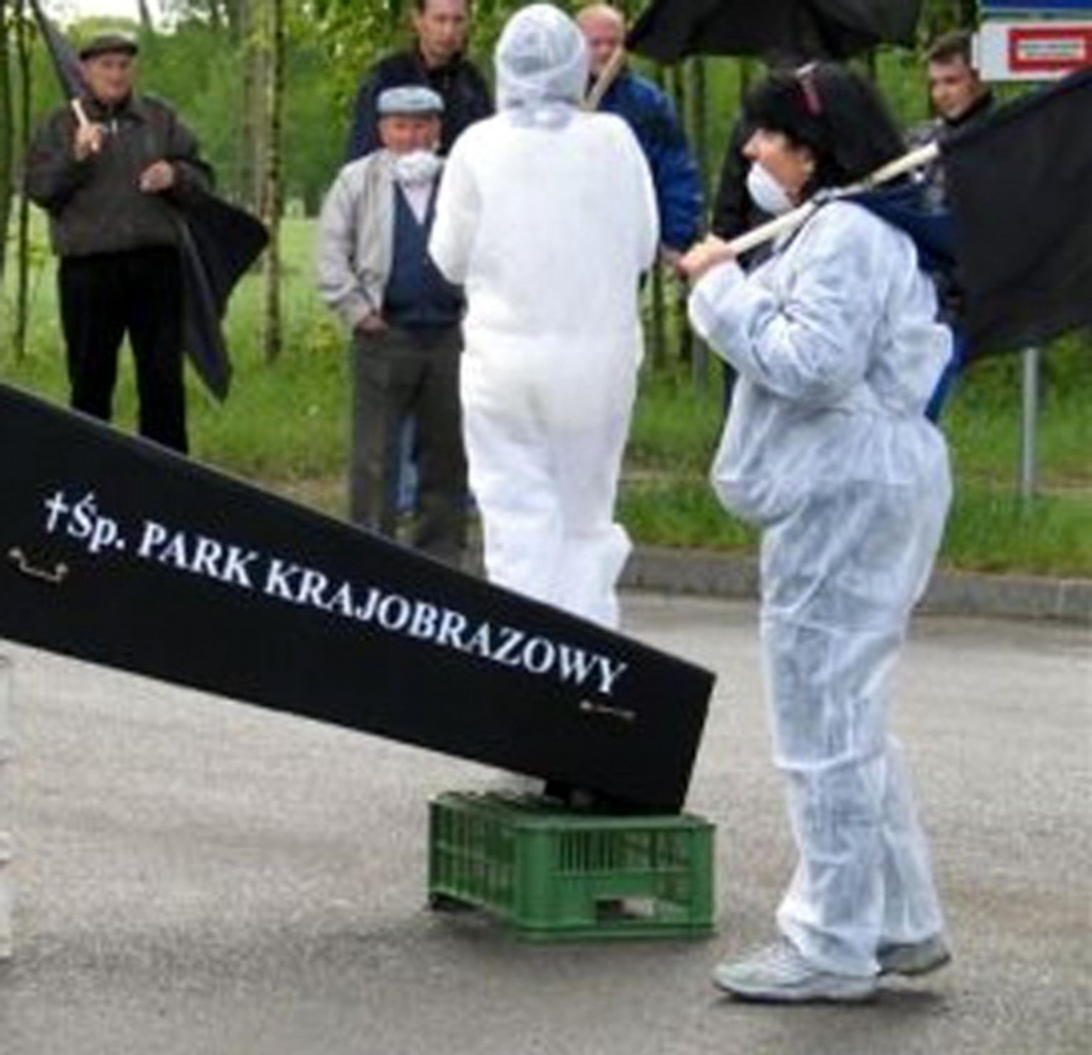 Protestujący mieli na sobie kombinezony. Były flagi i transparenty, przygotowano trumnę, która symbolizuje śmierć Trójmiejskiego Parku Krajobrazowego.