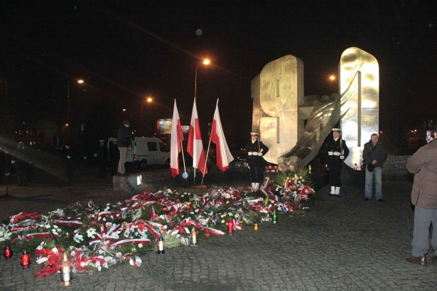 GDYNIA. Tradycyjnie, 17 grudnia o godz. 6, mimo przeraźliwego zimna, przed pomnikiem Ofiar Grudnia '70, w pobliżu stacji SKM Gdynia-Stocznia, niedaleko zlikwidowanej Stoczni Gdynia, gdzie przed 39 laty padły pierwsze strzały do robotników, uczczono rocznicę tej tragedii.