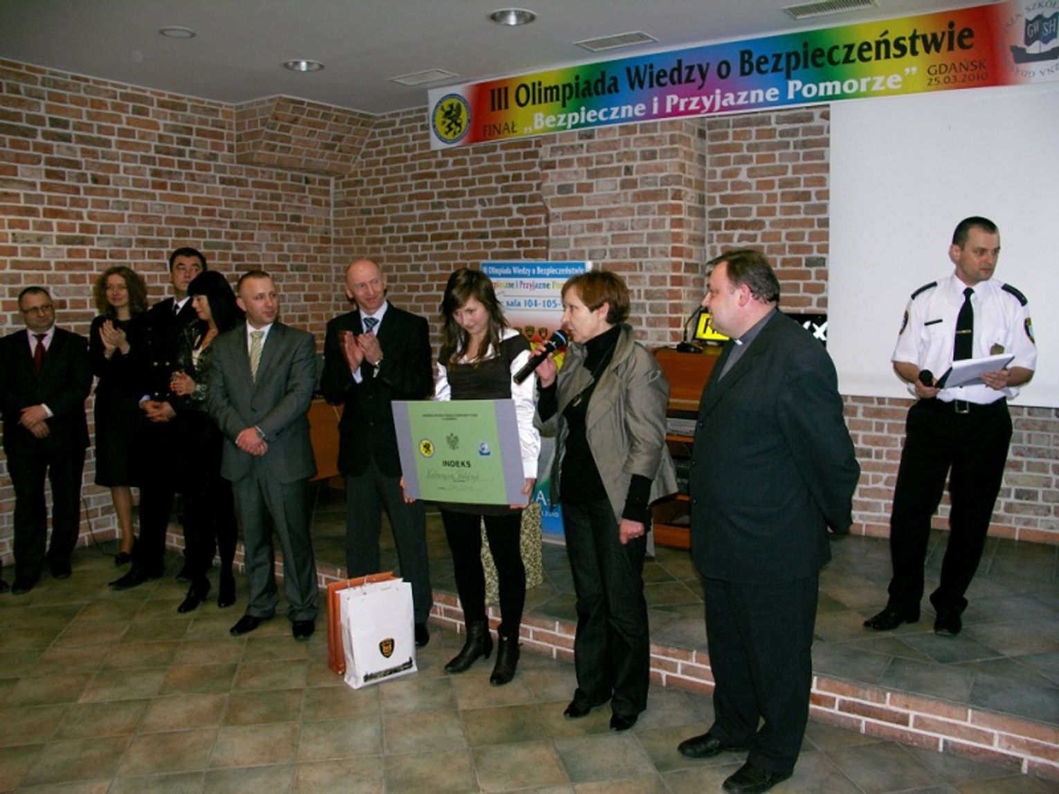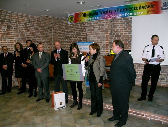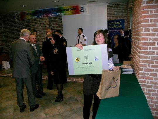 POMORZE. Katarzyna Ratajczyk z Gdańska zwyciężyła w III Finale Olimpiady Wiedzy o Bezpieczeństwie "Bezpieczne i przyjazne Pomorze" i zdobyła główną nagrodę - indeks Gdańskiej Wyższej Szkole Humanistycznej w Gdańsku. Drugie miejsce zajęła Beata Łęgowska z Pucka, a trzecie - Ludmiła Kołek z Pruszcza Gd. Finał odbył się tradycyjnie w GWSH na Biskupiej Górce.