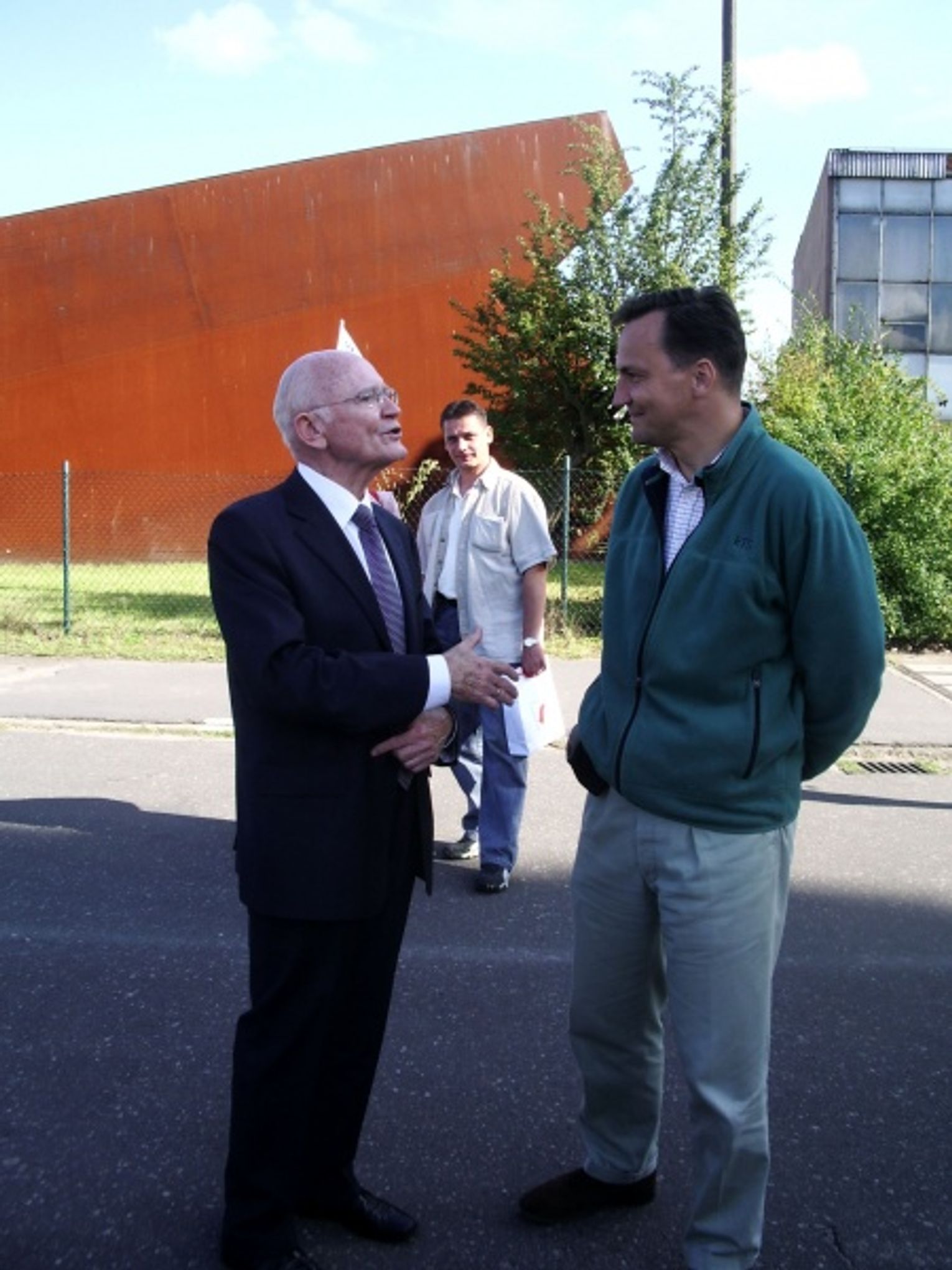Minister Sikorski pojawił się na terenie strajkowym Stoczni dopiero po odjeździe prezydenta Kaczyńskiego. Przybył nieoficjalnie, na luzie. Przeszedł przez historyczną bramę nr 2, na placu, z miejsca gdzie stacjonowali i szykowali się do pacyfikacji z pałami i czołgami ZOMO-wcy w maju i sierpniu 1988 r., na plac, gdzie stali stoczniowcy. Tam kilka minut porozmawiał z b. I sekretarzem Komitetu Wojewódzkiego PZPR Tadeuszem Fiszbachem (uczestnikiem strony rządowej w rozmowach ze strajkującymi, potem w niełaskach swojej partii i odsunięty ze stanowiska, a potem dyplomatą na terenach postsowieckich).
