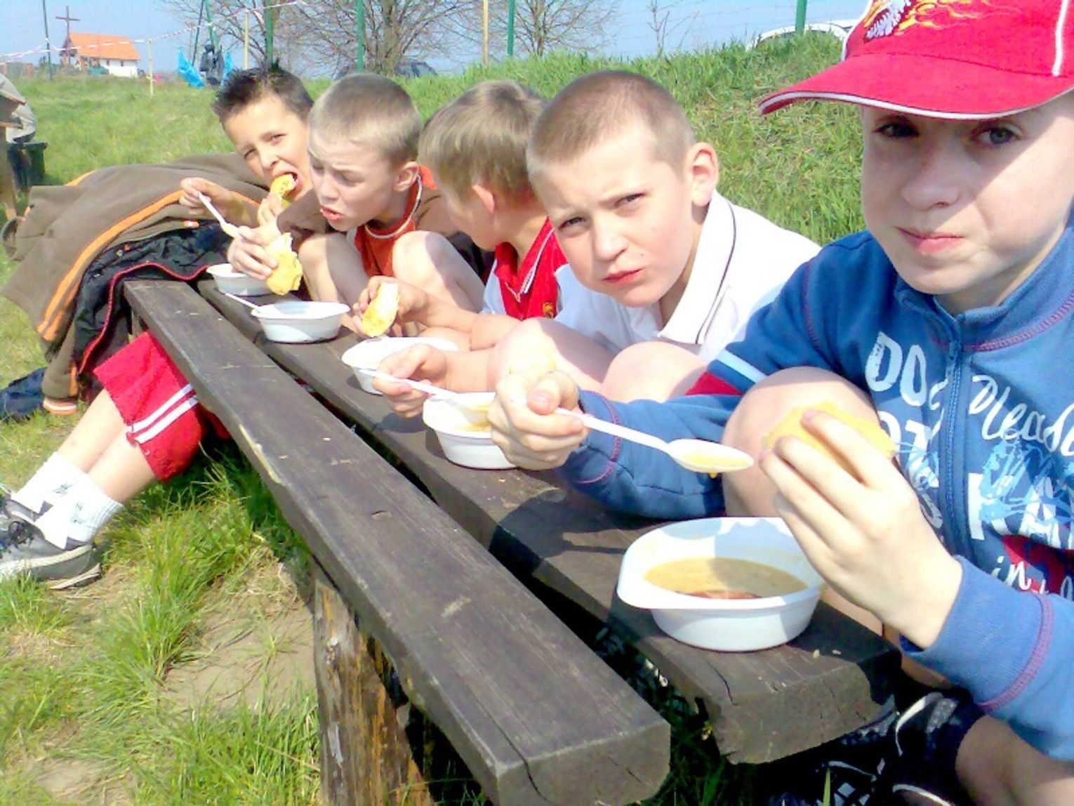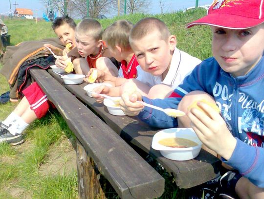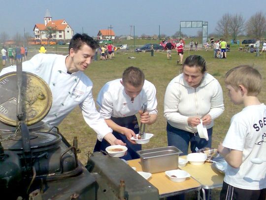 Kolejni zawodnicy biegają dzielnie wokół stadionu. Na środku boiska ustawiła się prawdziwa kuchnia polowa. Wydawane są gorące kiełbaski z bigosem. Bez ograniczenia. Jak ktoś potrafi zjeść kilka porcji to nikt mu tego nie zabrania.