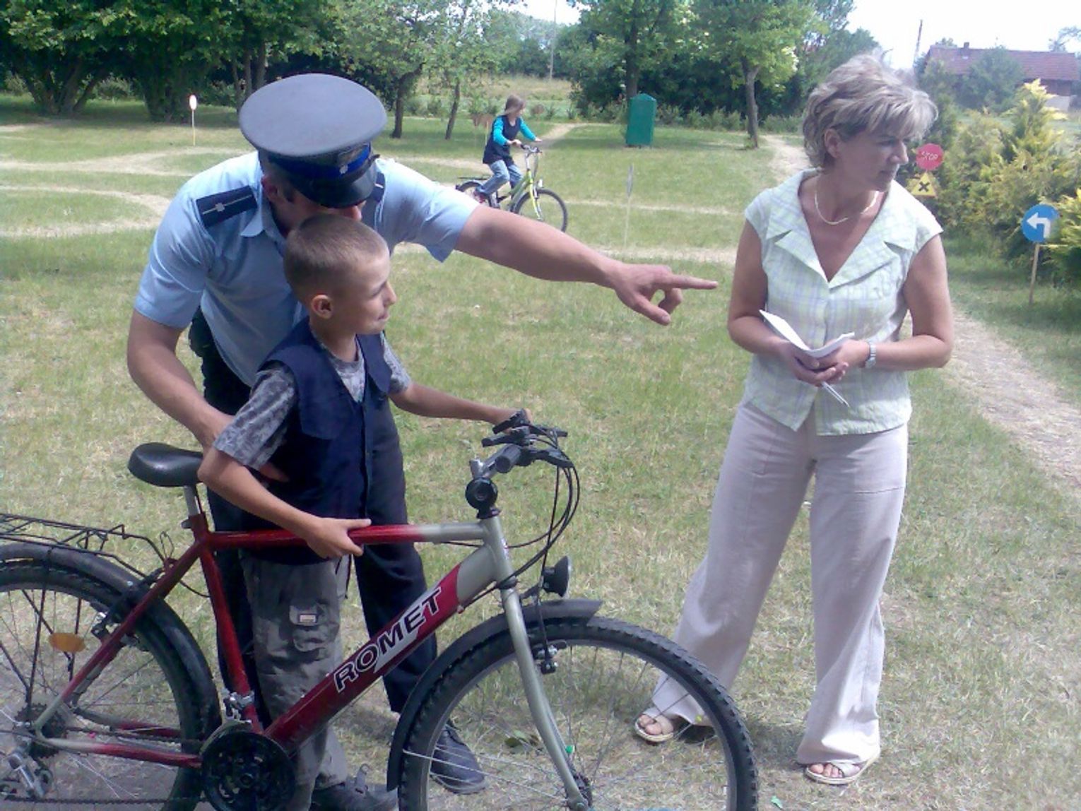 Na boisku szkolnym wygospodarowano spory placyk na Miasteczko Ruchu Drogowego. Wąskie, kręte ścieżki wiją się wśród równo skoszonej trawy. Przy ścieżkach poustawiano mnóstwo znaków drogowych.