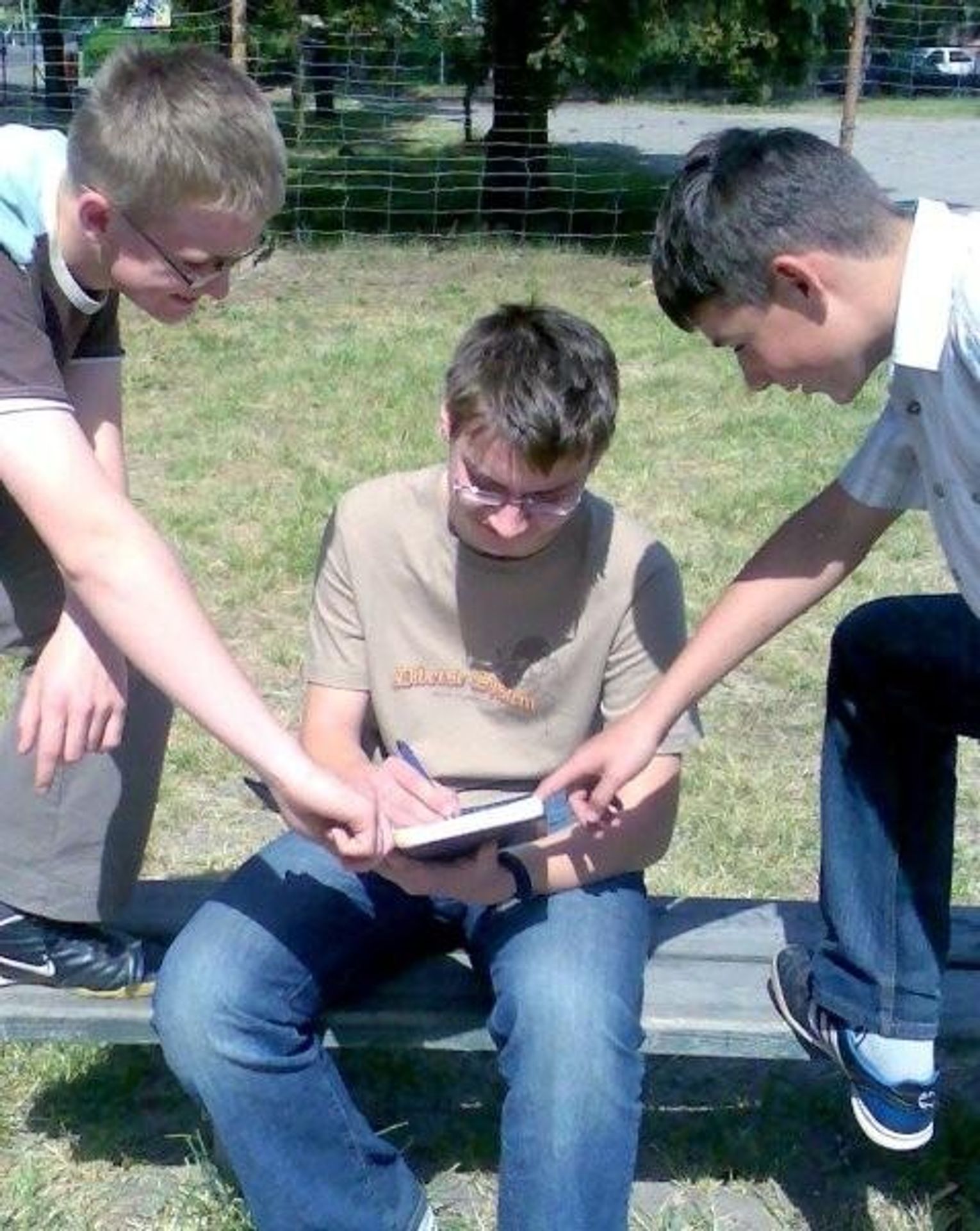 Na drewnianej ławce przed szkołą siedzi trójka rozdyskutowanych uczniów. Nie przeszkadza im, hałaśliwy nieco stukot dochodzący z placu budowy. Dyskutują o funkcjach, równaniach, wykresach.