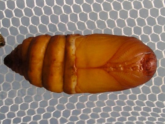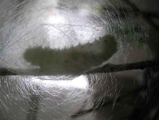 Na szczęście po tygodniu nagle i bez ostrzeżenia niemal wszystkie gąsienice wybudowały oprzędy. Zostały tylko dwie dziwaczki. Jedna, mimo że była już półtora raza większa od innych, ciągle jeszcze żerowała i zupełnie nie myślała o robieniu oprzędu, a druga wprawdzie szybko zabrała się za robotę, ale najwyraźniej zabrakło jej zmysłu architekta. Zamiast kulistego oprzędu wyszedł dywan. No cóż, w końcu nawet żeby rozłożyć namiot, trzeba pewnej wyobraźni przestrzennej, a co ma z podobnym problemem zrobić taki mały robaczek? Wszystko załatwia instynkt, ale wystarczy mały błąd w zaprogramowanych zachowaniach i co mamy? Klops, a właściwie to dywan. Gąsienica pracowała do ostatniej chwili nie dając za wygraną, ale w końcu musiała zamienić się w poczwarkę nie w kokonie, tylko leżąc sobie na swoim dywanie. Miało to też dobre strony, bo mogliśmy zobaczyć to, co normalnie przebiega w chronionym przed wścibskim wzrokiem obserwatorów wnętrzu kokonu.