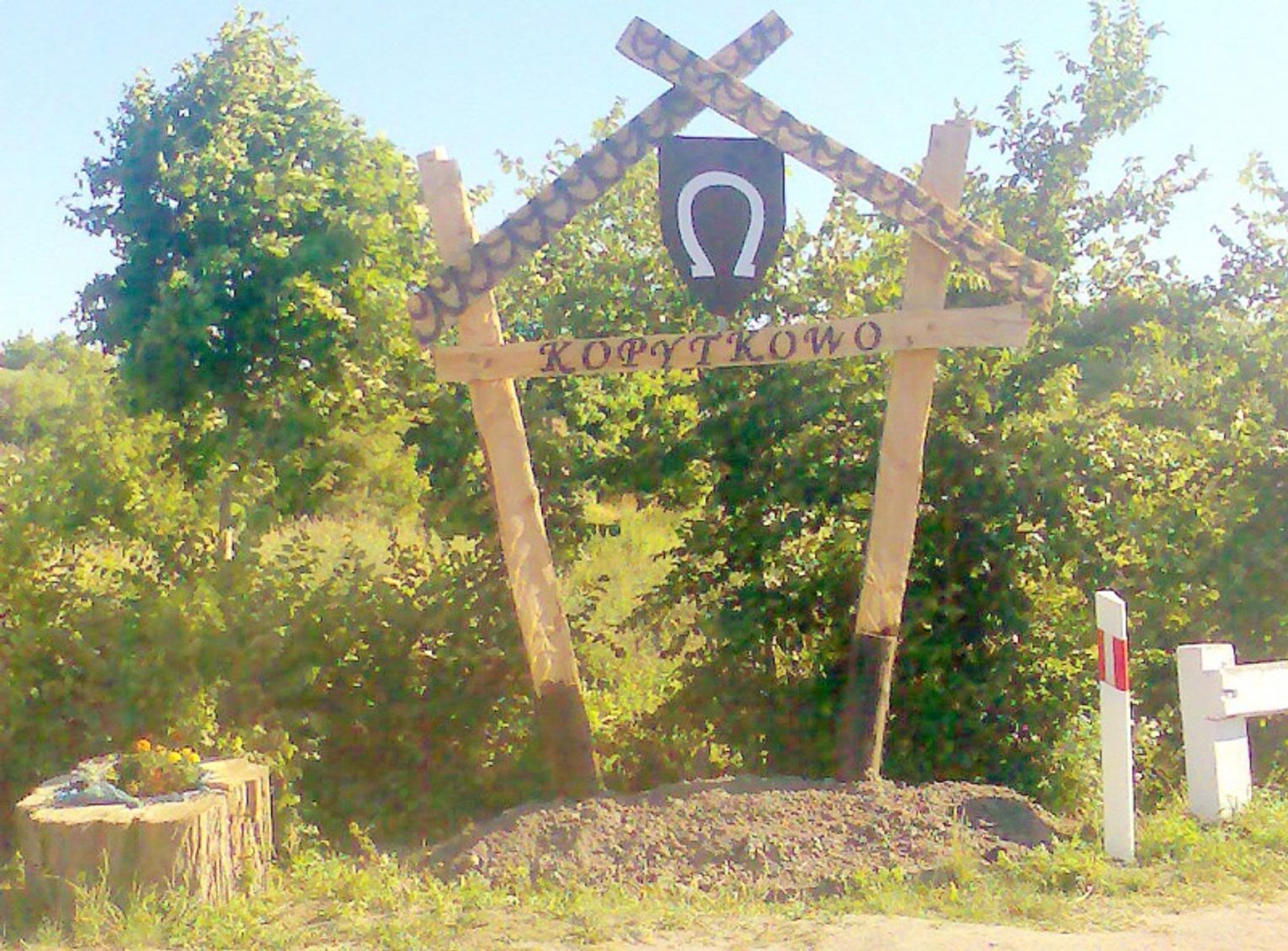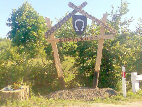 Tuż za ośrodkiem zdrowia widzę coś co każe się zatrzymać. Duża, drewniana brama z napisem Kopytkowo i herbem miejscowości.