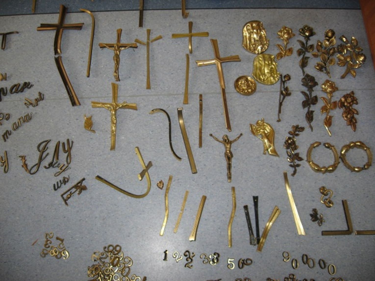 Sprzedając te elementy na skupie tłumaczył, że jest on pracownikiem zakładu produkującego pomniki, a mosiężne elementy pochodzą z renowacji starych grobów.
