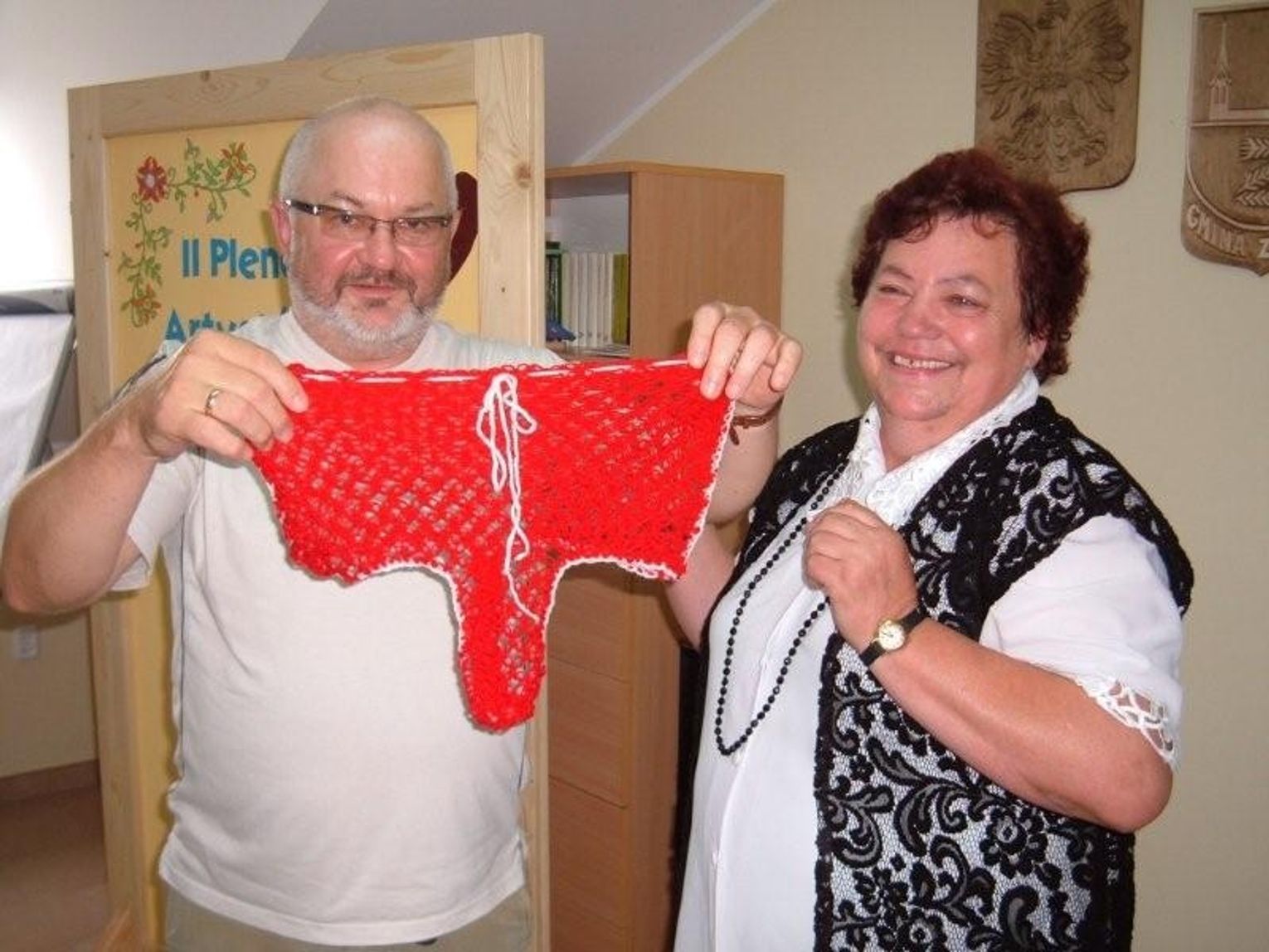 KOCIEWIE. W niedzielę zakończył się II Plener Artystów Ludowych Pomorza w Zespole Szkół Publicznych w Bytoni. Jedna z pań wydziergała szydełkiem stringi i podarowała je gościowi z Gdańska.