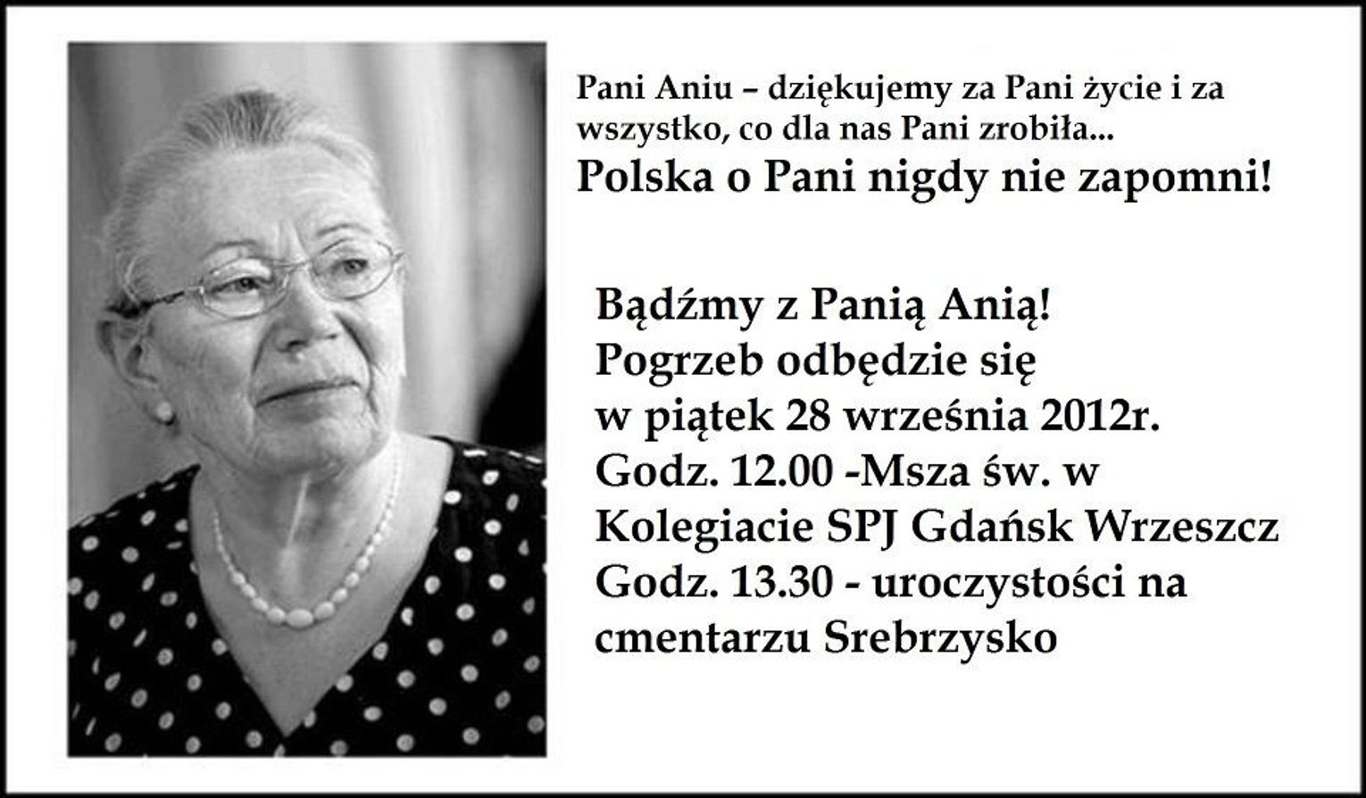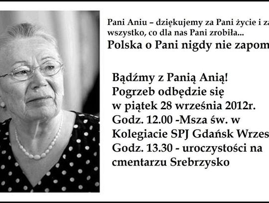 W piątek na cmentarzu Srebrzysko w Gdańsku-Wrzeszczu w grobie rodzinnym złożone zostaną w nowej trumnie właściwe szczątki tragiczne zmarłej w katastrofie smoleńskiej śp. Anny Walentynowicz. Obędzie się ceremonia pogrzebowa z udziałem Rodziny, Przyjaciół.