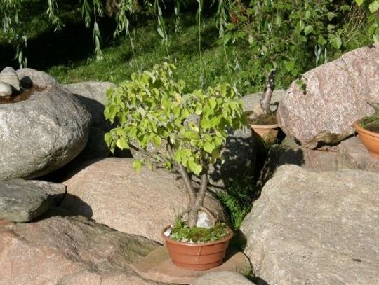 W ogrodzie - widok niezwykły. W dziesiątkach większych i mniejszych doniczek rosną miniaturowe drzewka. Niektóre (zwykle ze 40 – 50 cm wysokości) mają mocno powyginane konary i są doskonałymi kopiami sędziwych, leśnych olbrzymów.