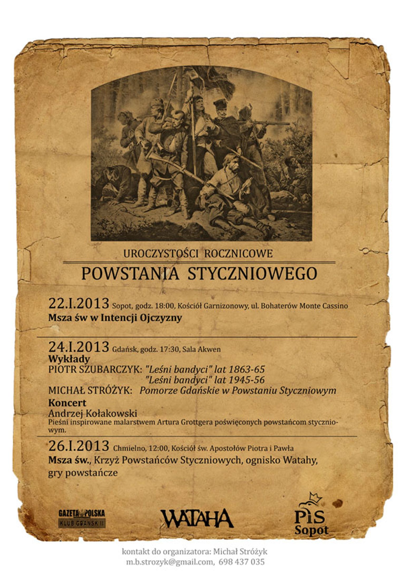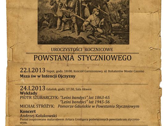 Gdańsk - 150 rocznica wybuchu Powstania Styczniowego Ognisko powstańcze na Górze Gradowej!!! 26 stycznia, godz 16.30 (sobota) Związek Żołnierzy Narodowych Sił Zbrojnych oraz Stowarzyszenie Kibiców Lechii Gdańsk "Lwy Północy" zapraszają na ognisko powstańcze. Ochotników do powstania - w każdym wieku, prosimy o zabranie biało-czerwonej opaski lub flagi, menażki lub miski, łyżki, kija do pieczenia kiełbasy (jak kto może) i chleba. O grochówkę i kiełbasę zadba kwatermistrz oddziału. Będziemy spiewać zapomniane pieśni Powstańców Styczniowych i "wspominać" insurekcję. Razem z nami w kręgu ogniska zasiądą kombatanci: żołnierze Armii Krajowej i Narodowych Sił Zbrojnych. Zbiórka o godz.16.oo na Cmentarzu Garnizonowym przy Pomniku dowódców Okręgu Wileńskiego AK oraz symbolicznych grobach Danuty Siedzikówny "Inki" i Feliksa Selmanowicza "Zagończyka"