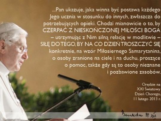 Odnośnie do relacji między wiarą a uczynkami miłości, słowa z Listu św. Pawła do Efezjan chyba najlepiej wyrażają ich wzajemne powiązanie: „Łaską bowiem jesteście zbawieni przez wiarę. A to pochodzi nie od was, lecz jest darem Boga: nie z uczynków, aby się nikt nie chlubił. Jesteśmy bowiem Jego dziełem, stworzeni w Chrystusie Jezusie do dobrych czynów, które Bóg (...) przygotował, abyśmy je pełnili” (2, 8-10). Widać z tego, że cała inicjatywa zbawcza pochodzi od Boga, od Jego łaski, od Jego przebaczenia przyjętego w wierze; ale ta inicjatywa bynajmniej nie ogranicza naszej wolności i naszej odpowiedzialności, lecz sprawia, że zyskują autentyczność i ukierunkowanie na dzieła miłosierdzia. Te ostatnie nie są owocem głównie wysiłku człowieka i powodem do chluby, ale rodzą się z samej wiary, wypływają z łaski, którą Bóg daje w obfitości. Wiara bez uczynków jest jak drzewo bez owoców: te dwie cnoty wynikają z siebie nawzajem. Wielki Post zachęca nas właśnie, poprzez tradycyjne wskazania odnośnie do życia chrześcijańskiego, abyśmy umacniali wiarę przez uważniejsze i dłuższe słuchanie Słowa Bożego oraz udział w sakramentach, a zarazem, byśmy wzrastali w miłości, w miłości do Boga i do bliźniego, także poprzez konkretne zalecenia postu, pokuty i jałmużny.