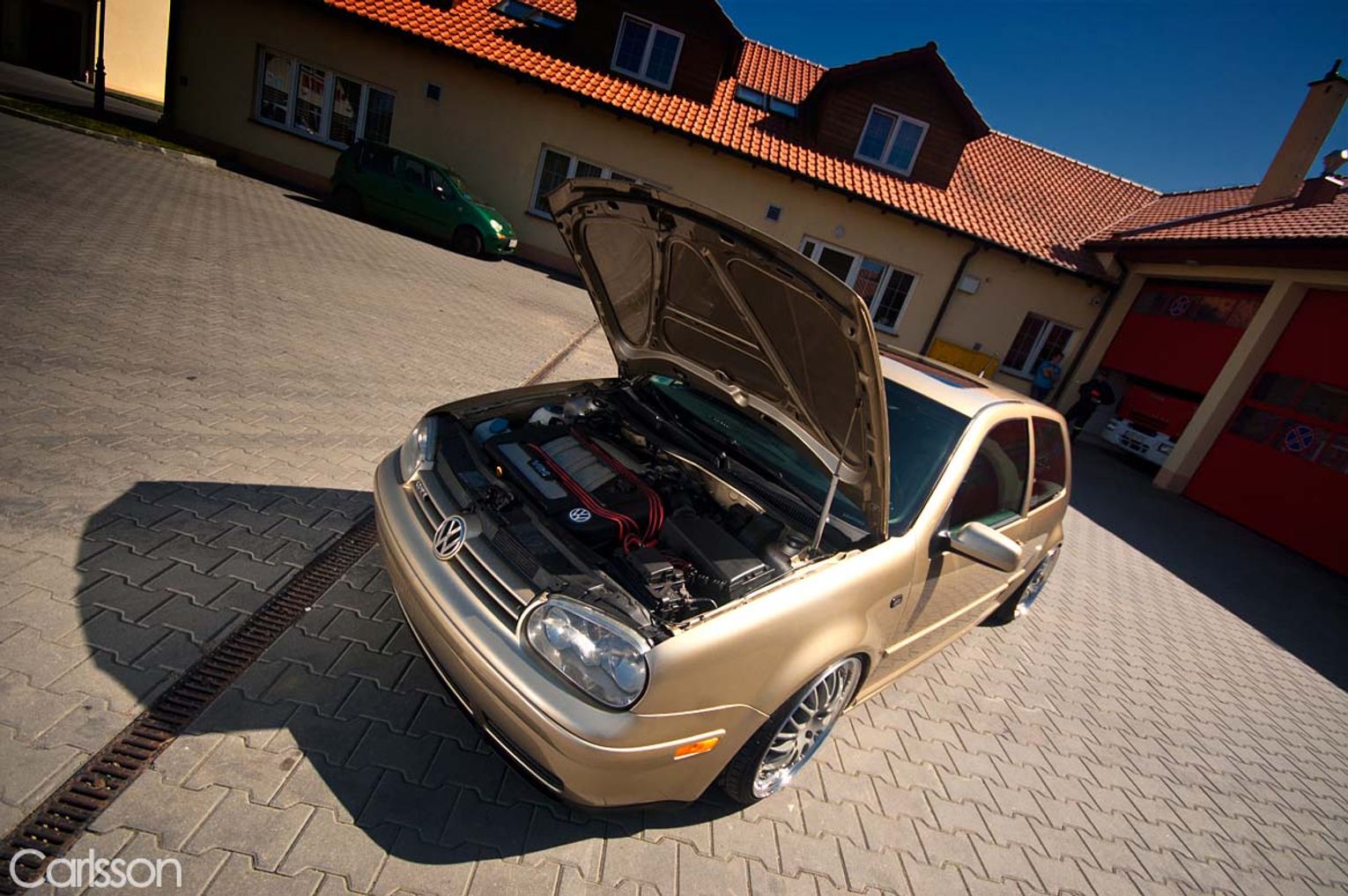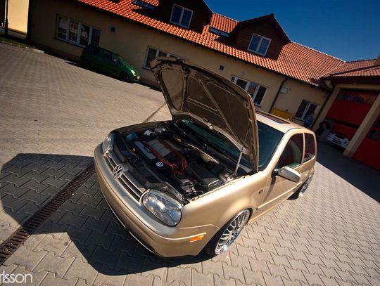 - Całkowicie przebudowanego Golfa IV GTi, w złotym kolorze i nietypowej amerykańskiej odmianie. Pod maską tego auta drzemie kultowy silnik VR6. Wnętrze i bagażnik to indywidualna praca zespołu stylistów, którzy wszystko wykonali ręcznie. Oprócz zmian stylistycznych i optycznych golf ma też regulowane zawieszenie pneumatyczne. Golfa postawiono na polerowanych felgach Porsche Eta Beta Krone. Oczywiście o średnicy 18 cali.