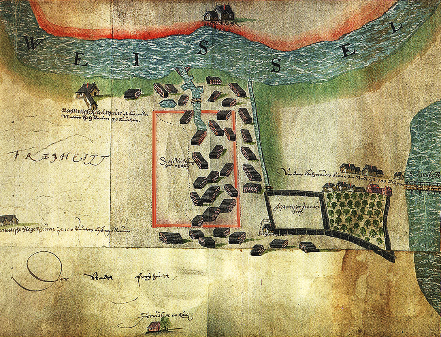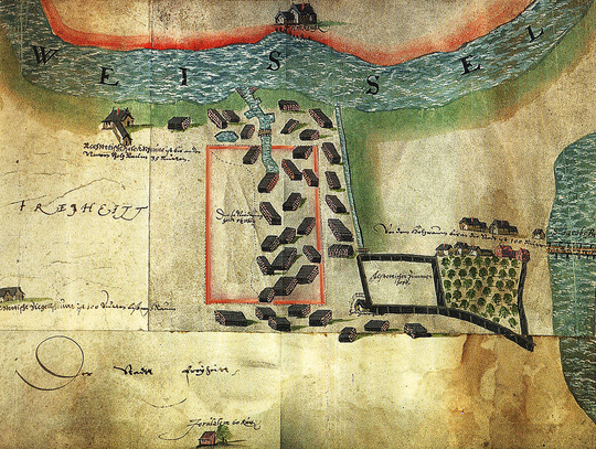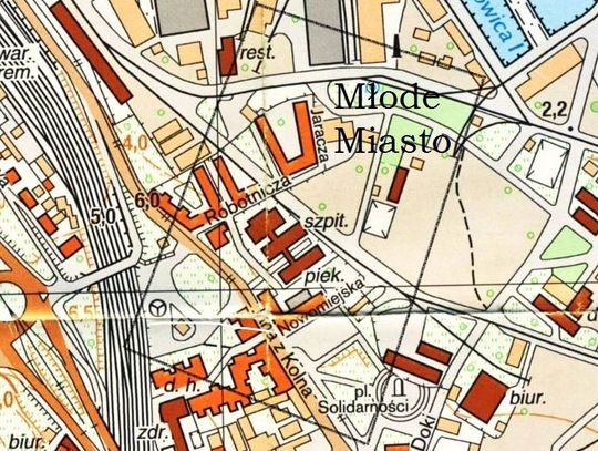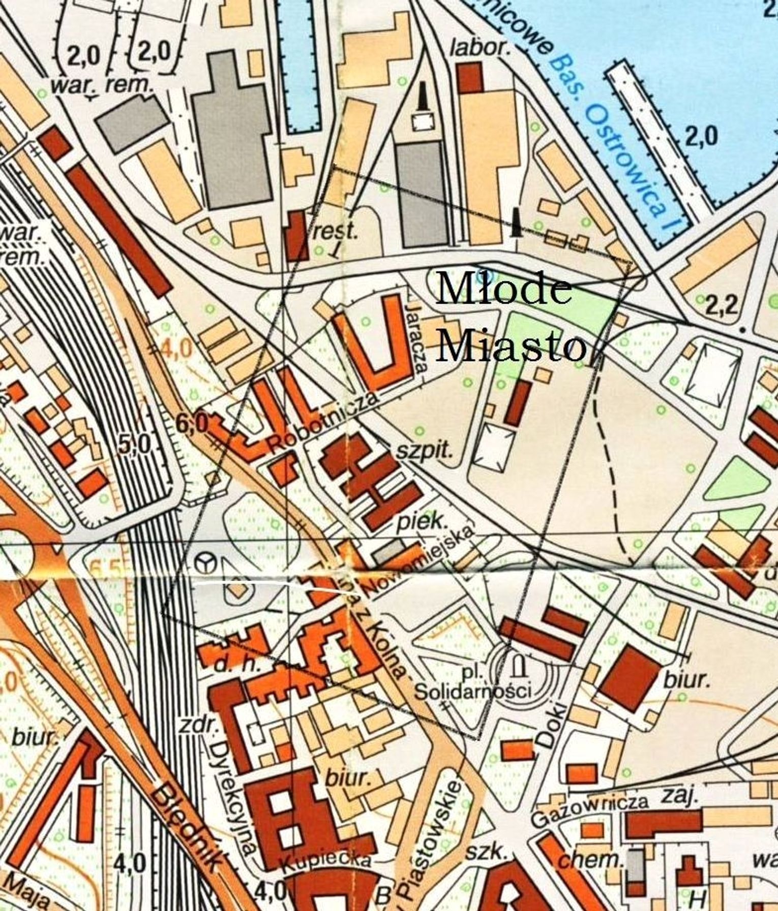 Gdzie dokładnie leżało Młode Miasto? Informacji na ten temat dostarcza m.in. inny plan Berndta, przedstawiający teren Młodomiejskiego Składu Drzewnego. Po prawej stronie jest fosa Starego Miasta z mostem przed bramą Św. Jakuba. U góry widać pozostałość portu: lekko załamany kanał uchodzący do Wisły, z przystaniami po bokach i mostkiem w środku. Intryguje obramowany czerwienią czworobok na środku placu. Rysunek jest utrzymany w skali, więc można określić jego rozmiary: ok. 270 m długości ma bok od strony Wisły i 290 od wzgórz, pozostałe dwa po ok. 370 m. Sumaryczny obwód 1300 m jest taki, jak w przywileju dla murów Młodego Miasta! Jak widać jest to zarys rozebranej dzielnicy, po której w 1601 r. musiały jeszcze istnieć jakieś ślady. Przenosząc go na współczesny plan znajdujemy jej teren – między torami kolejowymi i Martwą Wisłą, częściowo w rejonie stoczni. Ulice: Robotnicza, Jaracza i rejon zbiegu Jana z Kolna i Gdyńskich Kosynierów są na dawnym Młodym Mieście!