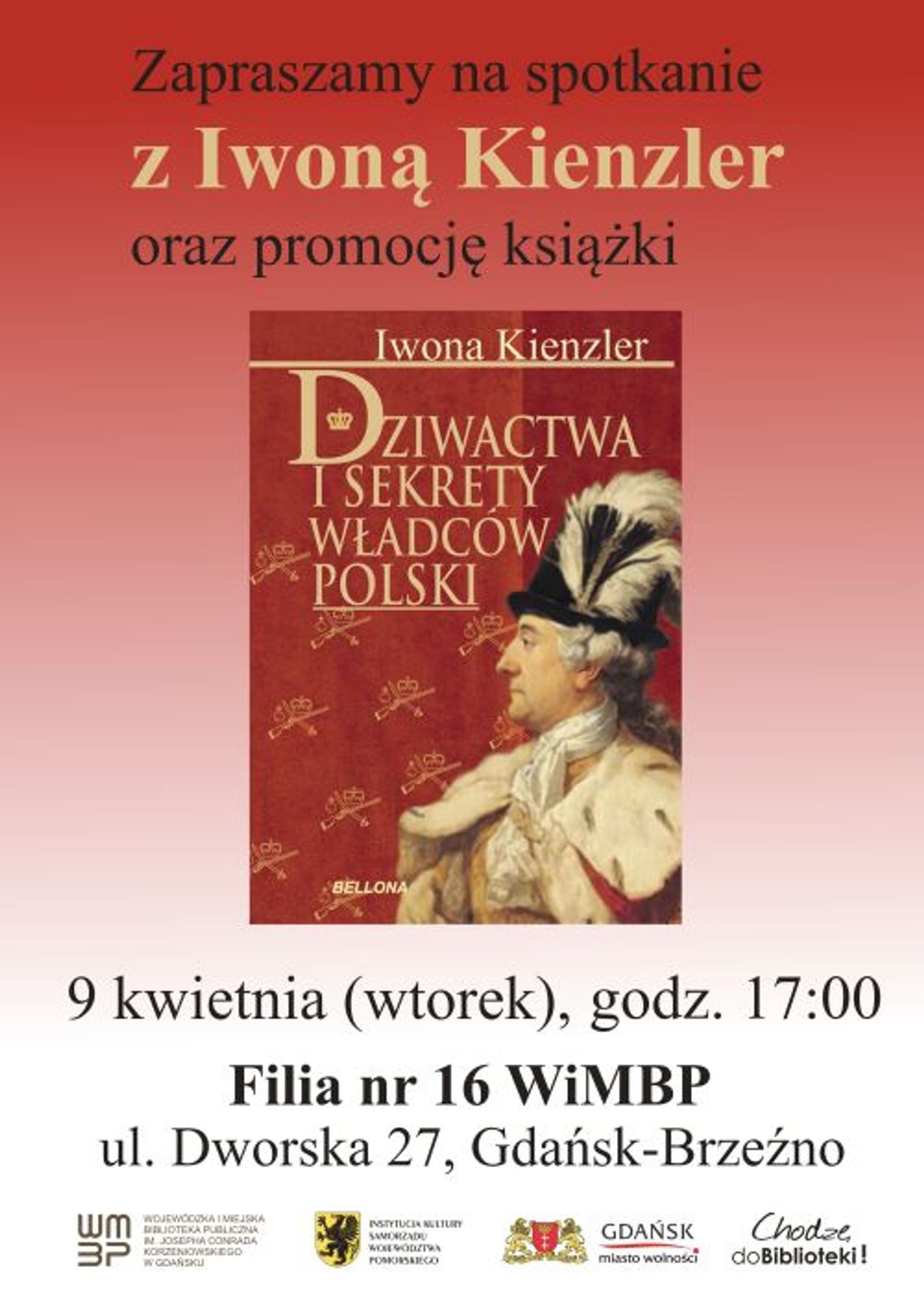 9 kwietnia (wtorek) o godz. 17:00 w Filii nr 16 WiMBP (ul. Dworska 27, Gdańsk-Brzeźno) odbędzie się spotkanie z Iwoną Kienzler i promocja jej najnowszej książki "Dziwactwa i sekrety władców Polski".
