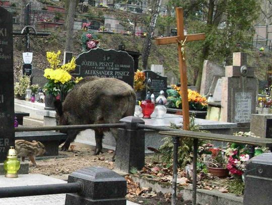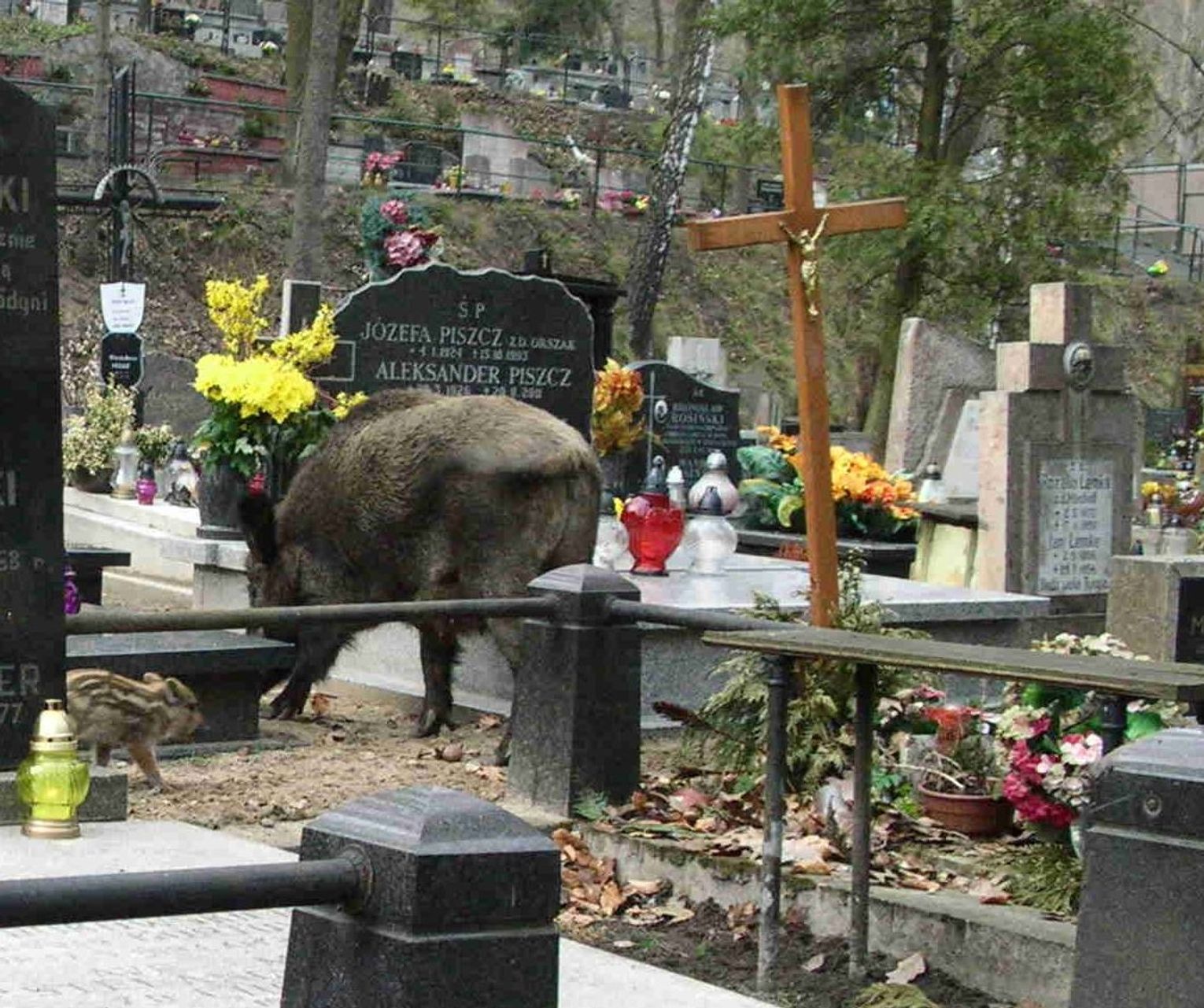 Spotkał stado dzików - lochę z małymi, które szukały między grobami pożywienia.