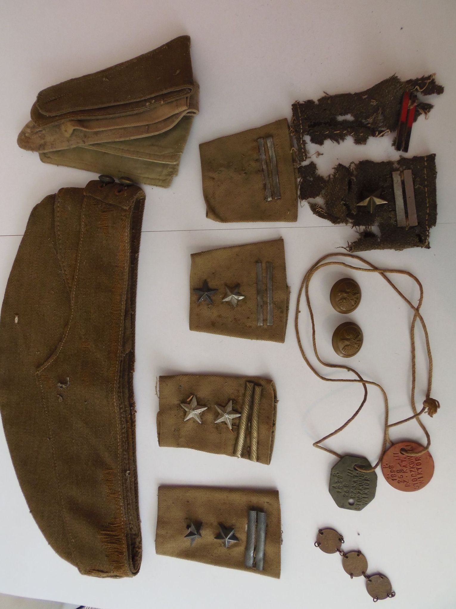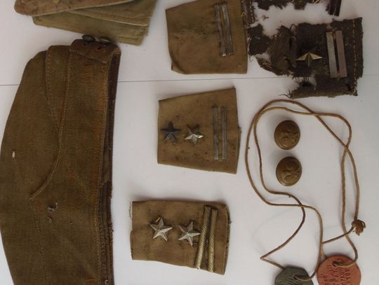 Do niezmiernie cennych, choć bardzo już zniszczonych, należą nakładki na pagony mundurowe. Dwie z nich są szczególnie ciekawe, mogły powstać w pierwszym okresie tworzenia Armii gen. Władysława Andersa. Tzw. belki wykonano ze zwykłej blachy, użyto również dwóch rodzajów gwiazdek z sowieckich sortów mundurowych. Inne nakładki przypominają o przedwojennej służbie i późniejszej w szeregach 2. Korpusu Polskich Sił Zbrojnych na Zachodzie. O tej ostatniej świadczą również dwa guziki z orłem w koronie używane do płaszcza mundurowego. Wśród sortów mundurowych należy jeszcze wymienić rogatywkę. W jej wnętrzu widoczna jest jej data produkcji – 1942 r. i oznaczenie producenta Silberston & Sons. Do tzw. sztuki okopowej można z kolei zaliczyć znaleziony w jednej ze skrzyń fragment bransolety wykonanej z przedwojennych polskich monet.