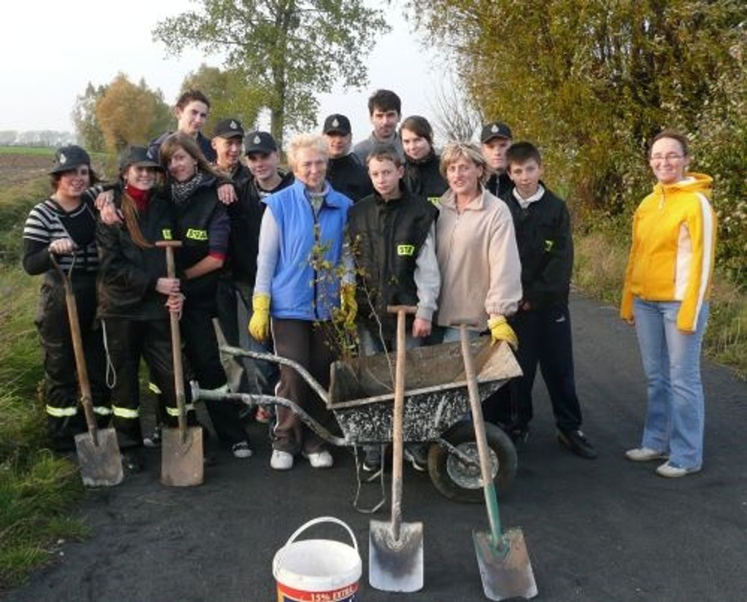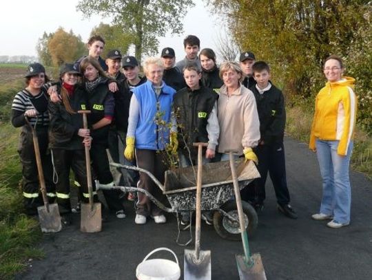 Za kościołem dołącza do nas młodzieżowa drużyna OSP z Pączewa ubrana w mundury strażackie. Kierujemy się pod Wysoką. W krótkim czasie, po sprawnie pokierowanej przez panią Teresę i Halinę oraz pana Andrzeja akcji, przy drodze zostaje zasadzona alejka lip, klonów, wiązów i grabów. Druhowie i druhny uwijają się, kopią, przysypują, biegają po wodę, podlewają… Jednak trzeba przyznać, że łopata najposłuszniej działa dowodzona przez… kobietę – naszą gospodynię wsi panią Halinę. Młodzież obserwuje i bierze przykład z mistrzyni. Naczelnik OSP Andrzej Czubek przyznaje z dumą, że drużyna młodzieżowa powstała 2 lata temu, czyli za jego kadencji. W tej chwili zrzesza blisko 10 druhen i 10 druhów. Nasze dzielne druhny tworzą jedyną w gminie drużynę dziewczęcą, zapewne dlatego do jej szeregów dołączyła filigranowa, roztańczona barłożanka – przyjaciółka pączewianek. Mimo krótkiego stażu nasze dziewczęta mają już na swoim koncie sukces - zdobyły trzecie miejsce w powiatowych zawodach strażackich w rywalizacji drużyn dziewczęcych! Zarówno druhowie jak i druhny z młodzieżówki całkiem niedawno brali aktywny udział w akcji ratowania naszego lokalnego środowiska naturalnego. Razem ze strażakami pełnili przez cały tydzień dyżur dniem i nocą, likwidując skutki zanieczyszczenia Węgiermucy substancjami ropopochodnymi.