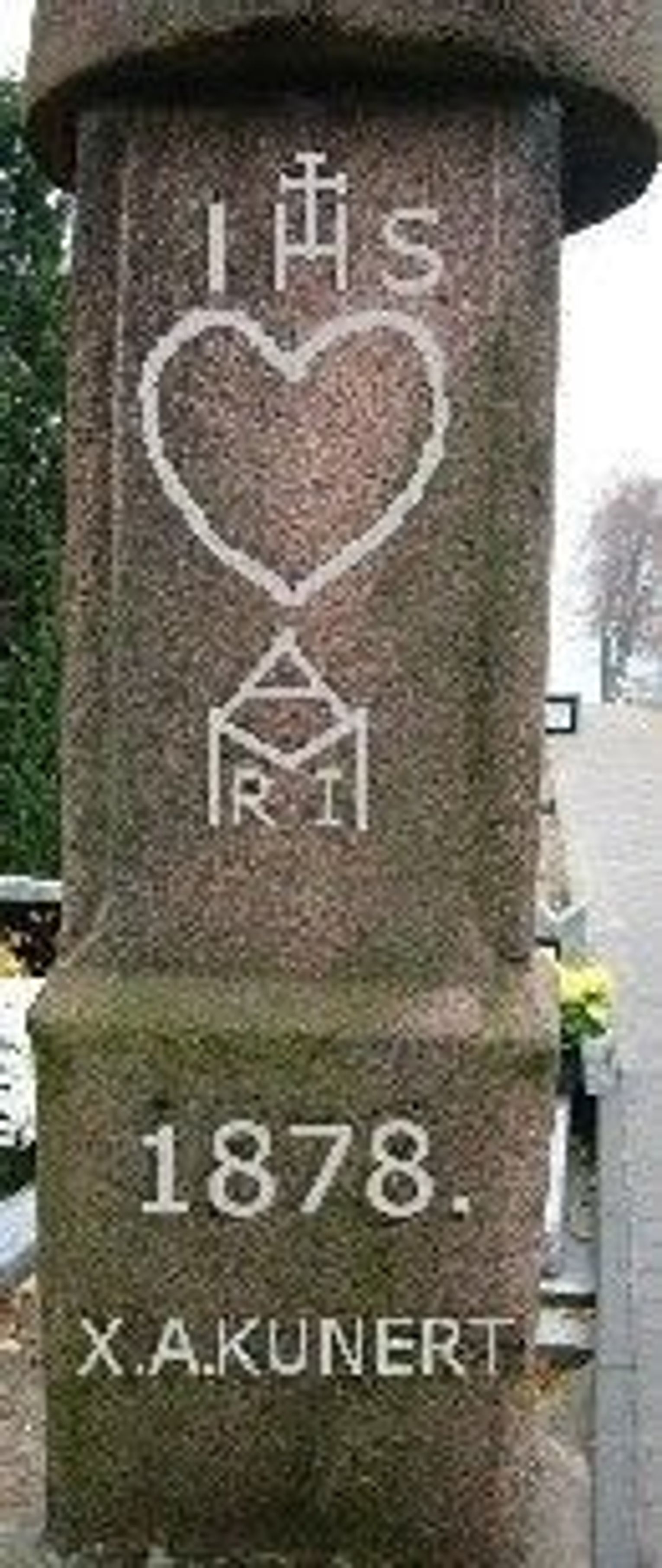 Ufundowany został przez proboszcza Alberta Kunerta, o czym zaświadcza inskrypcja fundacyjna na obelisku (1878 X. A. KUNERT). Wzniesiony został z czterech czworokątnych bloków granitu polnego. Ostatni - ostro wyprofilowany - zakończony był kutym, ażurowym, żelaznym krzyżem. W 1945 roku, przy wyzwalaniu Pączewa, krzyż ten uległ uszkodzeniu. W 1974 roku umocowano nowy ozdobny krzyż żelazny z grobu księdza Kunerta. Kilka lat temu jego miejsce zajął krzyż marmurowy. Środkowe dwie bryły kamienne ozdabia wypukły relief w kształcie serca oraz otaczające go z góry do dołu wklęsłe monogramy Jezusa i Marii. Pierwszy z nich: IHS - prócz zwyczajowej wykładni symbolicznej (IHS - to pierwsze litery imienia Jezus; według Jezuitów: Jesu humilis societas - Jezus człowieka Zbawiciel) - można tłumaczyć jako kryptonim łacińskiej sentencji "In Hoc Salus", czyli "W tym znaku zwyciężysz".