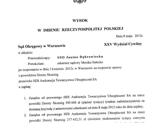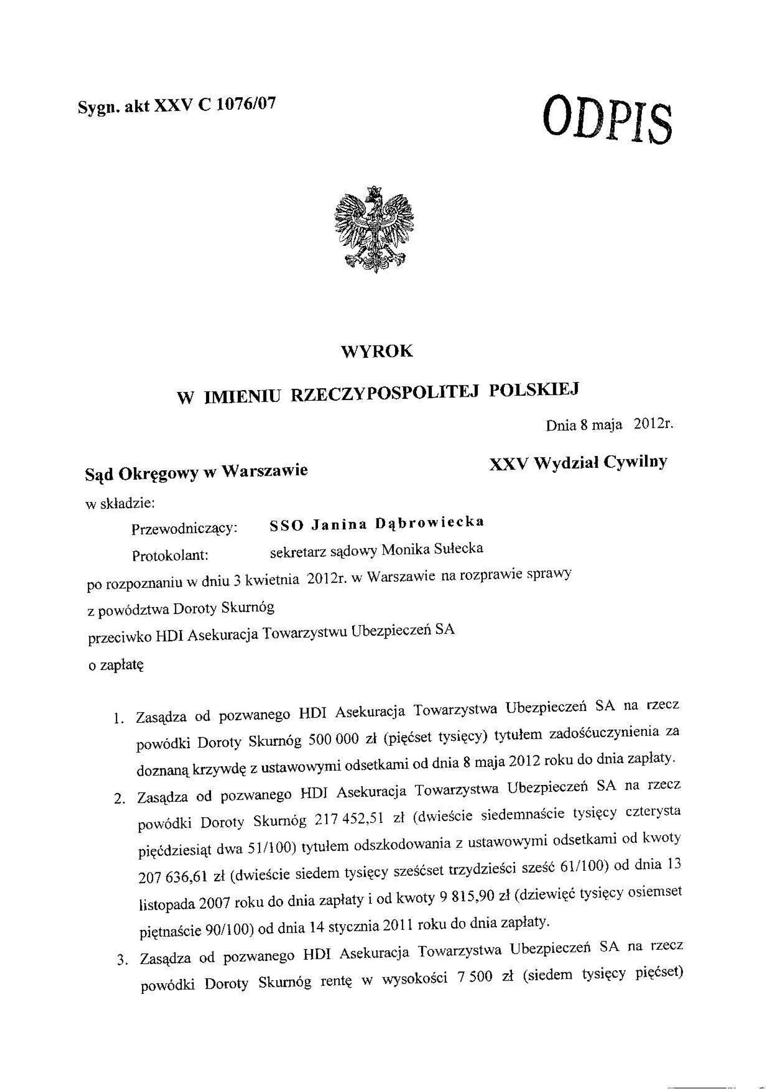 Apelację wnieśli zarówno powódka (o zwiększenia zadośćuczynienia i odsetki) oraz ubezpieczyciel (o odrzucenie roszczeń w całości). Ostatecznie 18.09.2013 r. Sąd Apelacyjny w Warszawie zasądził na rzecz powódki Doroty Skurnóg ponad 2,5 mln zł zadośćuczynienia, odszkodowania i odsetek oraz 12,3 tys. zł miesięcznej renty.