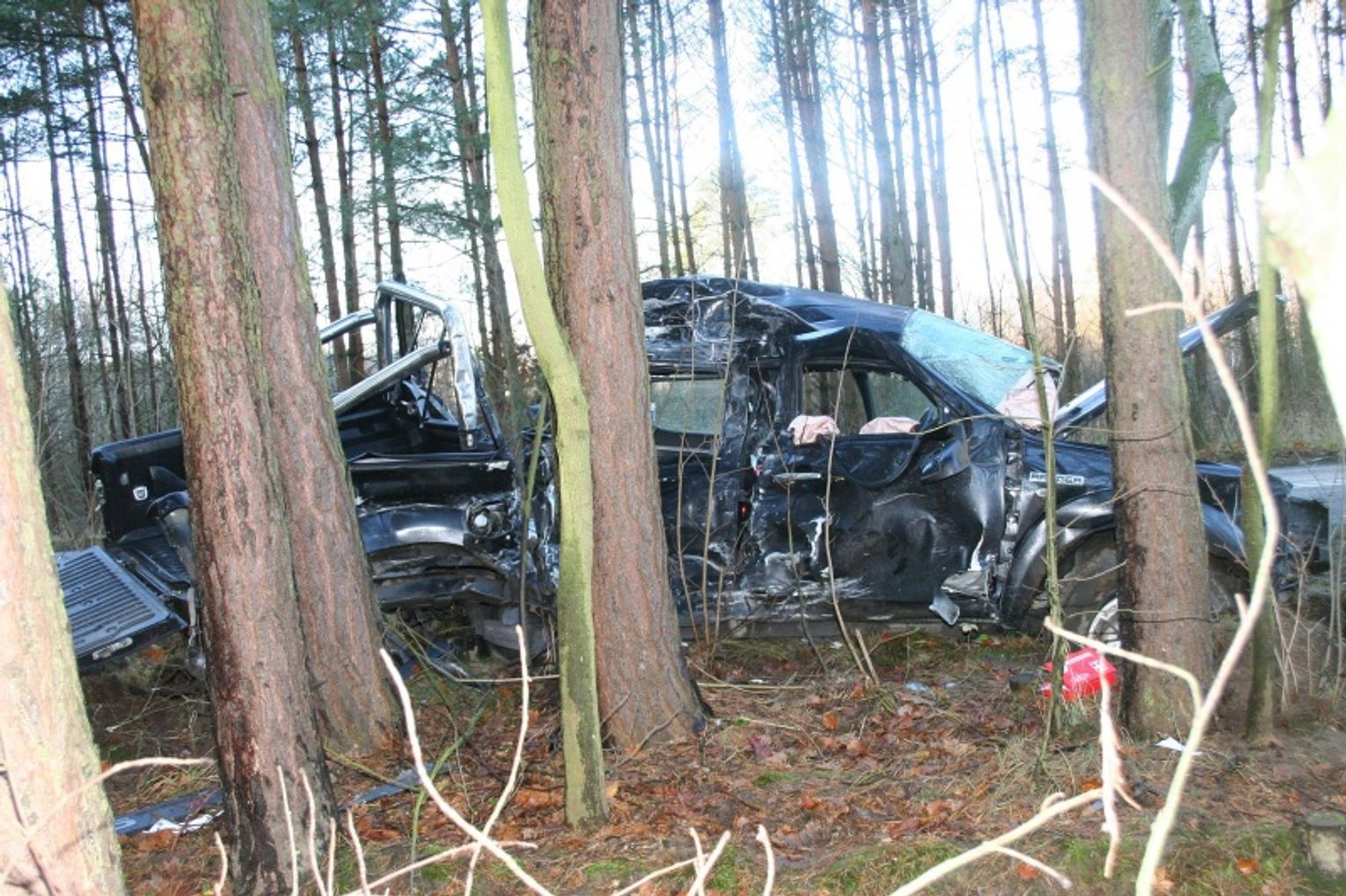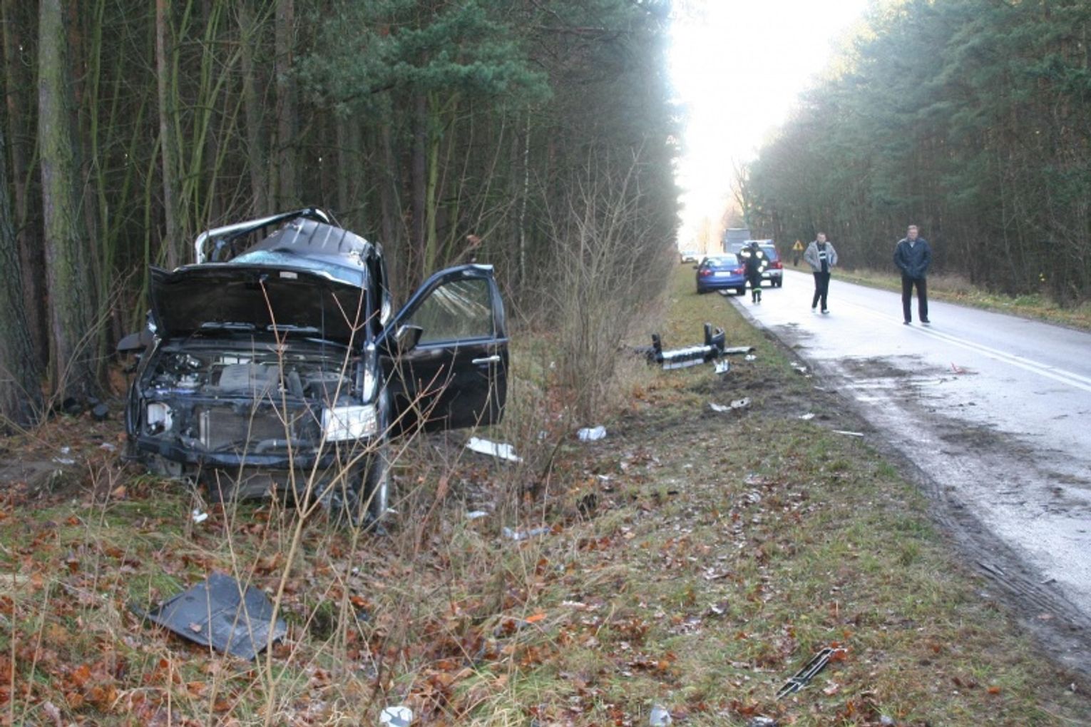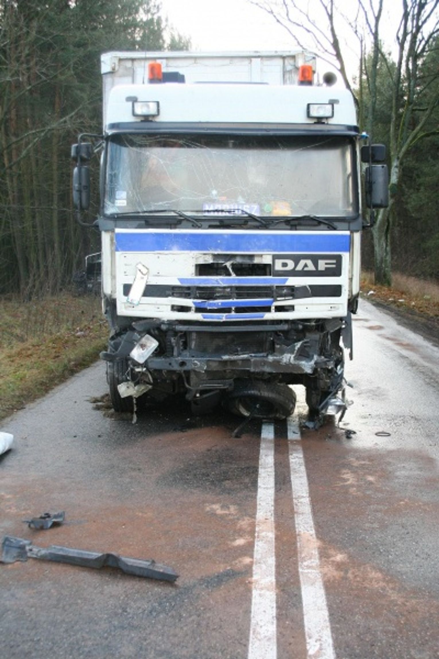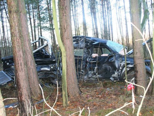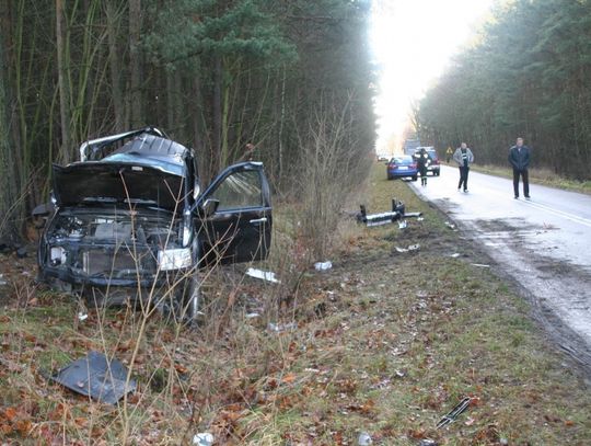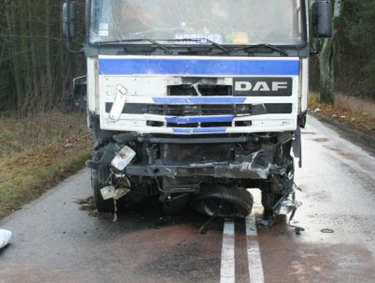 odrzucony na kilkanaście metrów. Ford zatrzymał się dopiero na drzewach znajdującego się nieopodal drogi lasu. Jego kierowca trafił do szpitala. W wyniku zderzenia przód ciężarówki i ford zostały całkowicie zniszczone. Osoby kierujące tymi pojazdami były trzeźwe.