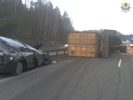 Policjanci z Wydziału Ruchu Drogowego gdyńskiej komendy ustalają przyczyny zdarzenia drogowego, do którego doszło na gdyńskim odcinku Obwodnicy, kilkanaście minut przed godz. 16.00. Jadący od strony Gdańska ciągnik siodłowy z naczepą gwałtownie hamował, co spowodowało przewrócenie się naczepy z kontenerem. Upadający zestaw zmiażdżył dwa pojazdy osobowe. Dwie inne osobówki zostały lekko uszkodzone. Wszyscy kierowcy byli trzeźwi, do szpitala z niegroźnymi obrażeniami trafiły 3 osoby. Utrudnienia w ruchu zakończyły się dwie godziny po północy.
